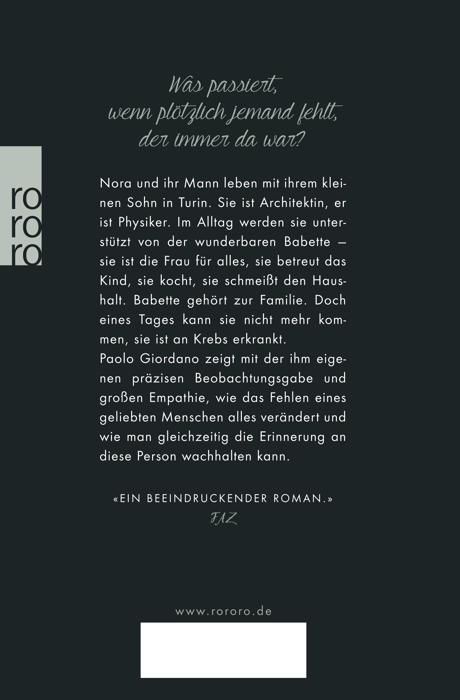 Nora und ihr Mann leben mit ihrem kleinen Sohn in Turin. Sie ist Architektin, er ist Physiker. Im Alltag werden sie unterstützt von der wunderbaren Babette - sie ist die Frau für alles, sie betreut das Kind, sie kocht, sie schmeißt den Haushalt. Babette gehört zur Familie. Doch eines Tages kann sie nicht mehr kommen, sie ist an Krebs erkrankt. Paolo Giordano zeigt mit der ihm eigenen präzisen Beobachtungsgabe und großen Empathie, wie das Fehlen eines geliebten Menschen alles verändert und wie man gleichzeitig die Erinnerung an diese Person wachhalten kann.