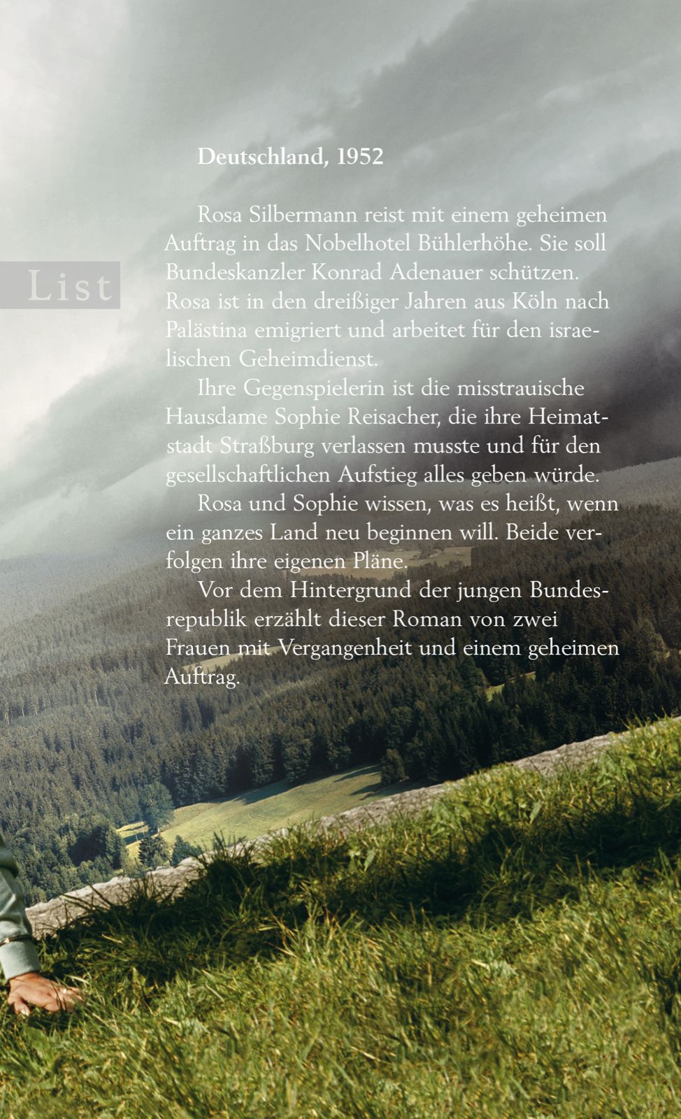 Rosa Silbermann reist mit einem geheimen Auftrag in das Nobelhotel Bühlerhöhe. Sie soll Bundeskanzler Konrad Adenauer schützen. Rosa ist in den dreißiger Jahren aus Köln nach Palästina emigriert und arbeitet für den israelischen Geheimdienst. Ihre Gegenspielerin ist die misstrauische Hausdame Sophie Reisacher, die ihre Heimatstadt Straßburg verlassen musste und für den gesellschaftlichen Aufstieg alles geben würde. Rosa und Sophie wissen, was es heißt, wenn ein ganzes Land neu beginnen will. Beide verfolgen ihre eigenen Pläne.