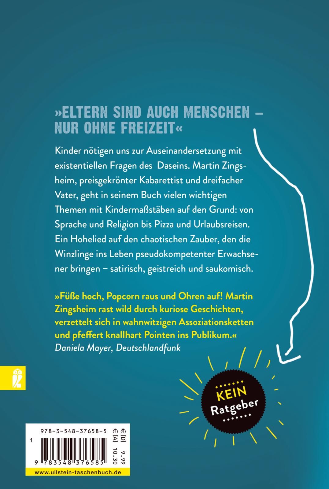 Kinder nötigen einen zur Auseinandersetzung mit existenziellen Fragen des Daseins: Wer bin ich? Wer hat die Erde gemacht? Warum sind nur die eigenen Pupse lustig? In seinem Buch geht der Kabarettist und dreifache Vater Martin Zingsheim vielen wichtigen Themen mit Kindermaßstäben auf den Grund: von Sprache und Religion bis Pizza und Pauschalreisen. Ein satirisches Hohelied auf den chaotischen Zauber, den die Winzlinge ins Leben pseudokompetenter Erwachsener bringen.