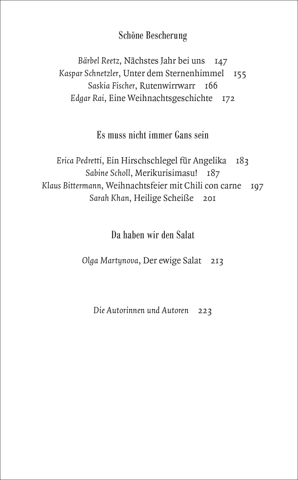 lt;p>Was passiert, wenn der Edeka auf der kleinen Ostseeinsel vor dem Fest keine TK-Gans mehr im Angebot hat? Man schießt sich selber eine. Ob der Braten geschmeckt hat, wird der geneigte Leser nicht mehr erfahren, denn ihn hat schon die nächste Protagonistin im Schlepptau, die mit einem Fresskorb zum Flüchtlingslager unterwegs ist, denn Weihnachten ist das Fest der Nächstenliebe - derweil andernorts der Großvater einsehen muss, dass er des Weihnachtsbratens ohne elektrisches Messer nicht Herr wird, und das vor den Enkeln, am Heiligen Abend! Dass so ein Festessen wegen Familienturbulenzen auch einmal ganz entfallen kann - davon erzählen Tanja Dückers, Daniel Schreiber, Robert Stadlober, Edgar Rai, David Wagner, Antonia Baum, Olga Martinova und viele andere.