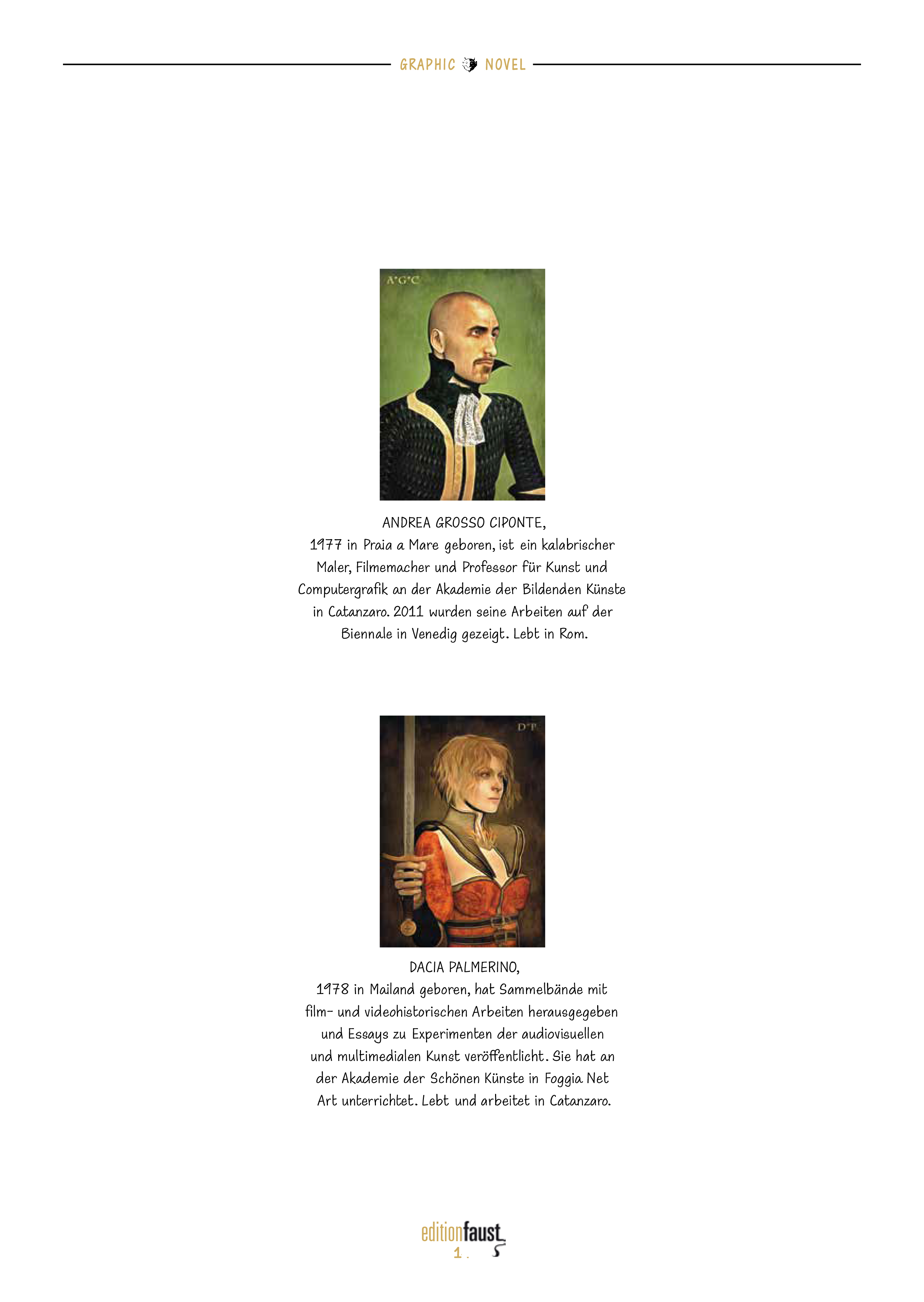 Andrea Grosso Ciponte, der 1977 in Praia a Mare geboren wurde, ist ein kalabrischer Maler, Filmemacher und Kunstprofessor sowie Professor für Computergrafik an der Akademie der Bildenden Künste in Catanzaro. 2011 wurden seine Arbeiten auf der Biennale in Venedig gezeigt. Dacia Palmerino, 1978 in Mailand geboren, hat film- und videohistorische Sammlungen herausgegeben und Essays zu Experimenten der audiovisuellen und multimedialen Kunst veröffentlicht. Sie hat an der Akademie der Schönen Künste in Loggia Net Art unterrichtet. Lebt und arbeitet in Catanzaro.