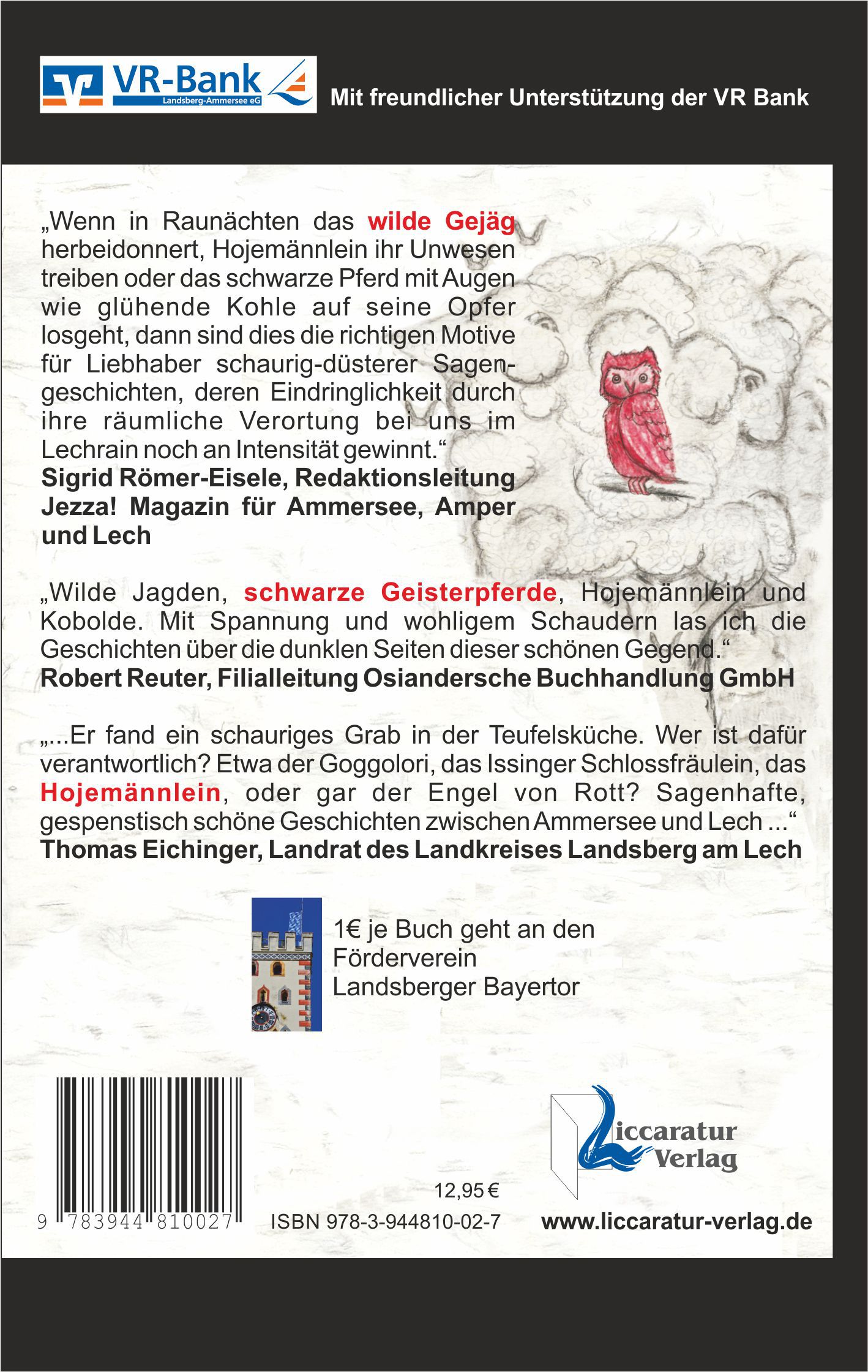 „ ... Er fand sein schauriges Grab in der Teufelsküche. Wer ist dafür verantwortlich? Etwa der Goggolori, das Issinger Schlossfräulein, das Hojemännlein, oder gar der Engel von Rott? Sagenhafte, gespenstisch schöne Geschichten zwischen Ammersee und Lech ... „