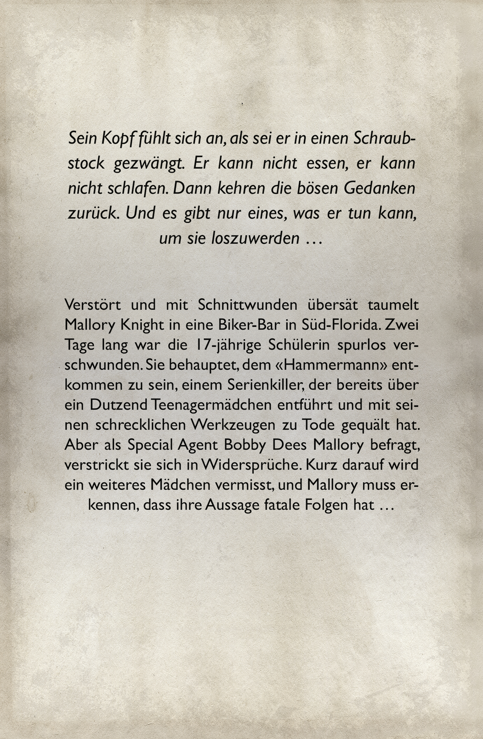 Verstört und mit Schnittwunden übersät taumelt Mallory Knight in eine Biker-Bar in Süd-Florida. Zwei Tage lang war die 17-jährige Schülerin spurlos verschwunden. Sie behauptet, dem "Hammermann" entkommen zu sein, einem Serienkiller, der bereits über ein Dutzend Teenagermädchen entführt und mit seinen schrecklichen Werkzeugen zu Tode gequält hat. Aber als Special Agent Bobby Dees Mallory befragt, verstrickt sie sich in Widersprüche. Kurz darauf wird ein weiteres Mädchen vermisst, und Mallory muss erkennen, dass ihre Aussage fatale Folgen hat...