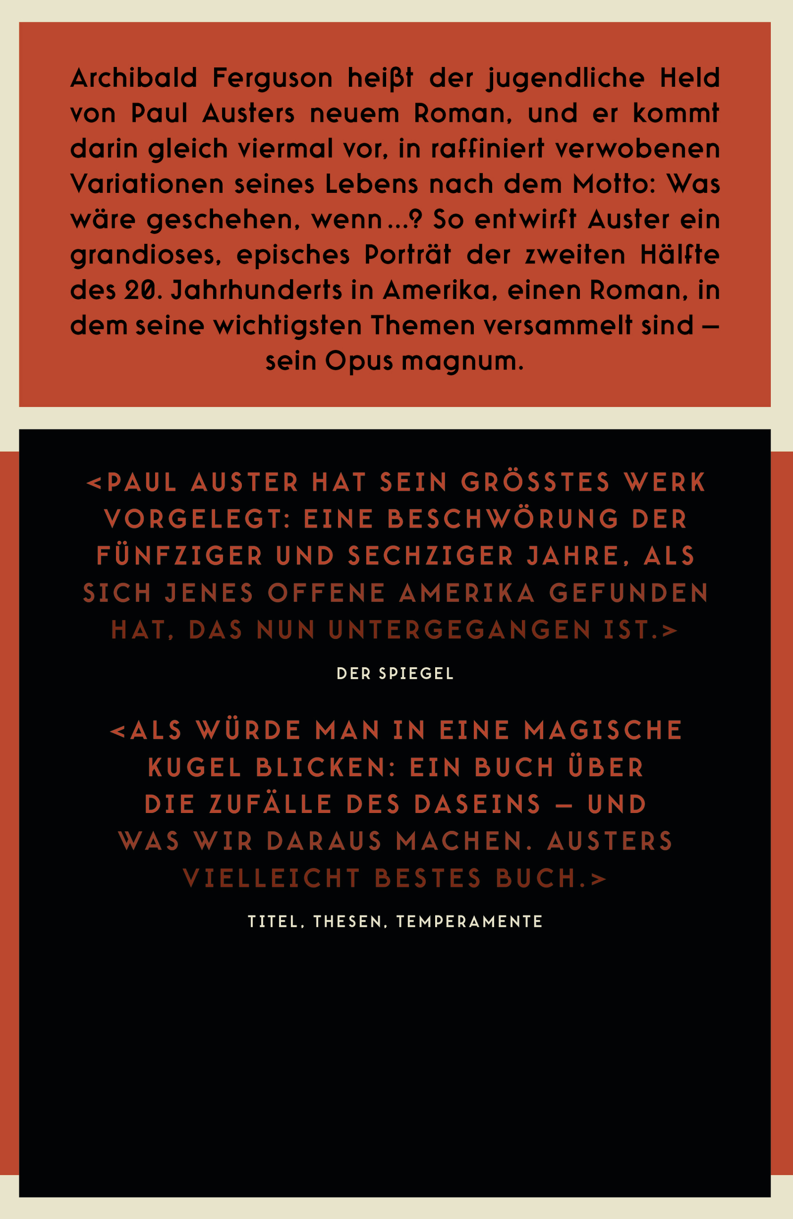 Austers Roman ist vieles in einem: ein Familienepos, die Geschichte dreier Familien, die vielfältig miteinander verflochten sind. Ein Zeitroman, eine postmodern verspielte Autobiographie. Ein Roman übers Erwachsenwerden, eine Parabel über das menschliche Schicksal und die sich endlos gabelnden Wege, denen sich ein Mensch auf seinem Gang durchs Leben stellen muss.