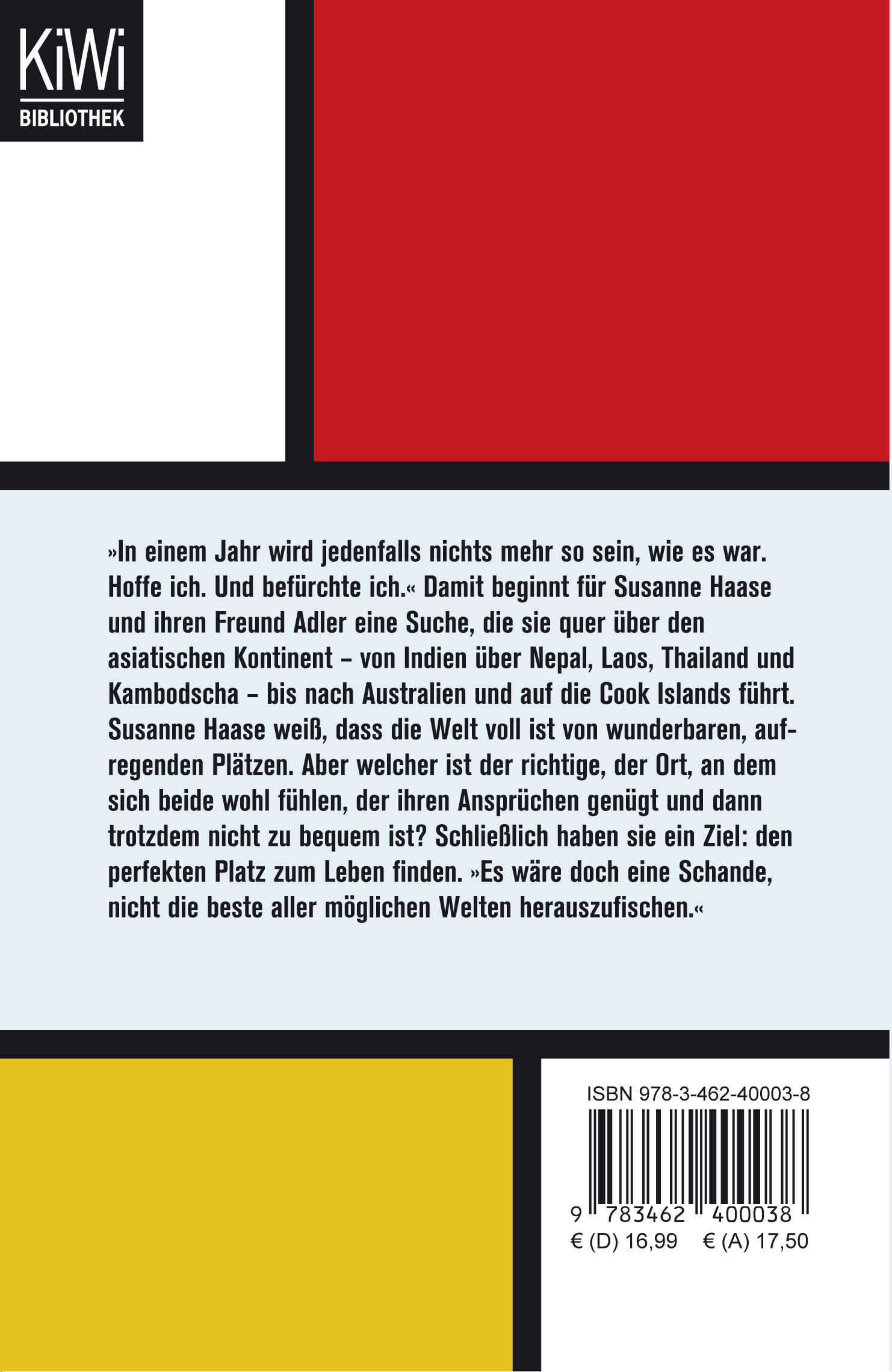 "In einem Jahr wird jedenfalls nichts mehr so sein, wie es war. Hoffe ich. Und befürchte ich." Damit beginnt für Susanne Haase und ihren Freund Adler eine Suche, die sie quer über den asiatischen Kontinent - von Indien über Nepal, Laos, Thailand und Kambodscha - bis nach Australien und auf die Cook Islands führt. Susanne Haase weiß, dass die Welt voll ist von wunderbaren, aufregenden Plätzen. Aber welcher ist der richtige, der Ort, an dem sich beide wohl fühlen, der ihren Ansprüchen genügt und dann trotzdem nicht zu bequem ist? Schließlich haben sie ein Ziel: den perfekten Platz zum Leben finden. "Es wäre doch eine Schande, nicht die beste aller möglichen Welten herauszufischen."
