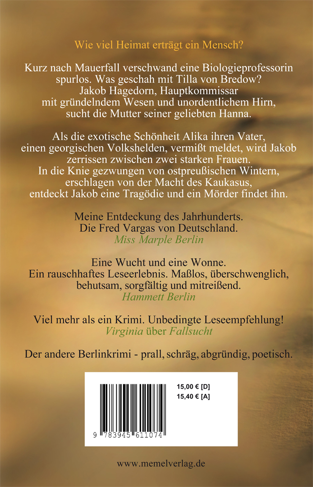 Kurz nach Mauerfall verschwand eine Biologieprofessorin spurlos. Was geschah mit Tilla von Bredow? Jakob Hagedorn, Hauptkommissar mit gründelndem Wesen und unordentlichem Hirn, ist nach seiner Rehabilitierung kaltgestellt. Er nutzt die Zeit und sucht die Mutter seiner geliebten Hanna. Als die exotische Schönheit Alika jedoch ihren Vater, einen georgischen Volkshelden, vermißt meldet, darf Jakob auf die Straßen der Stadt zurückkehren. Zerrissen zwischen zwei starken Frauen, in die Knie gezwungen von ostpreußischen Wintern, erschlagen von der Macht des Kaukasus, entdeckt er eine Tragödie und ein Mörder findet ihn.