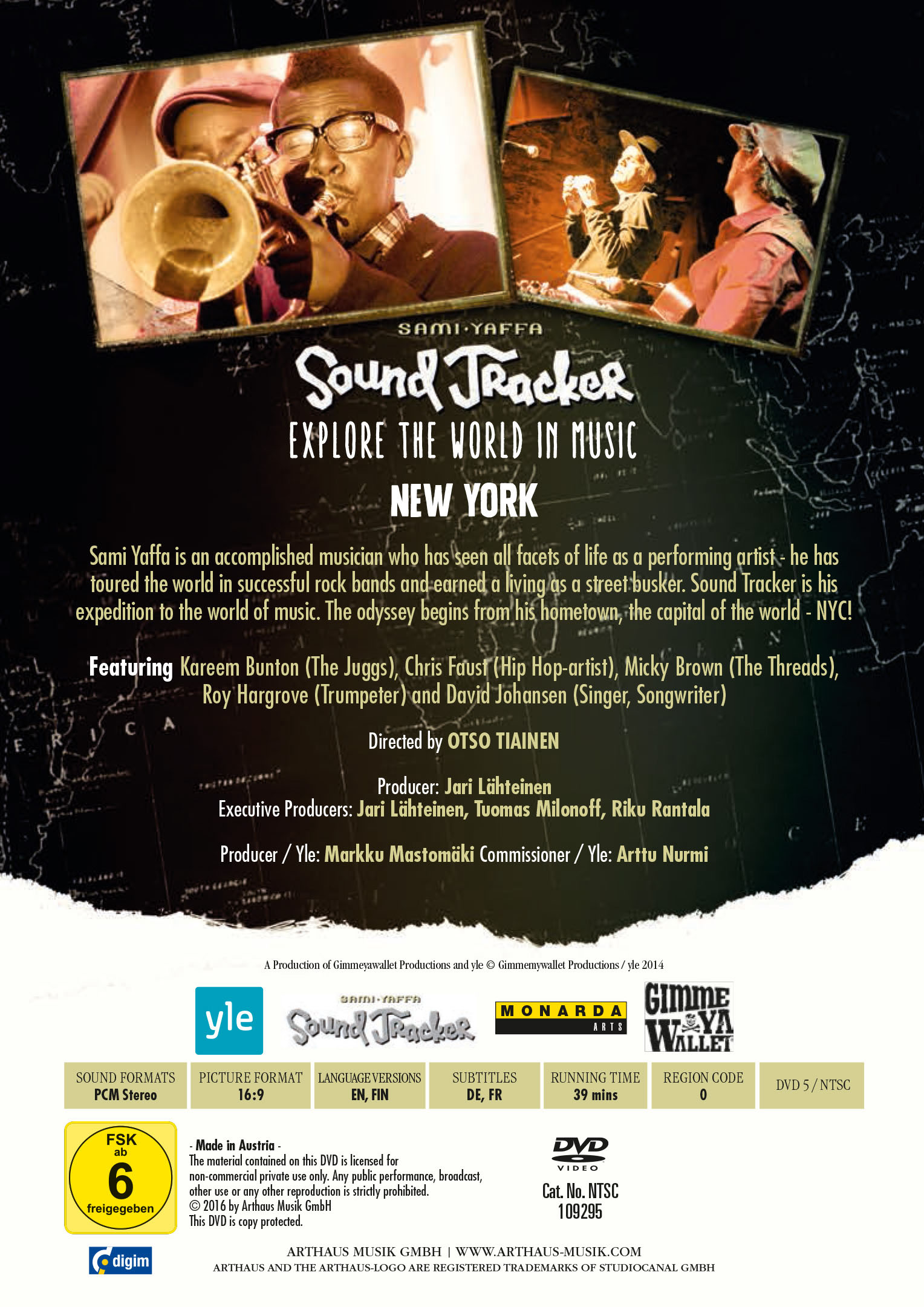 Hallo mein Name ist Sami Yaffa, ich bin Rockmusiker mit einer schier endlosen Neugier und reise seit ich sechzehn bin um die Welt, immer auf der Suche nach neuem Musikalischen. Ich liebe die Musik und tauche ein in unbekannte Kulturen und ihre Klangwelten. Mit diesen Sätzen beginnt die erfolgreiche TV-Serie Sound Tracker aus Finnland. Sami Yaffa, der finnische Bassist und Multiinstrumentalist, begibt sich auf einen musikalischen Road Trip um die Welt - von den USA über Jamaika und Argentinien, der Türkei und Serbien, bis nach Indien und Indonesien. Dabei gilt es die landestypische Musik zu erkunden. Sami beginnt, mit den Einheimischen zu musizieren und ihre Kulturen kennenzulernen. Auch wenn die Musik noch so unterschiedlich sein kann, eines wird deutlich - Musik ist überall, sie verbindet und ist ein wesentlicher Bestandteil unseres Lebens. Die Odyssee beginnt in Sami Yaffas Heimatstadt, der Weltmetropole New York City!