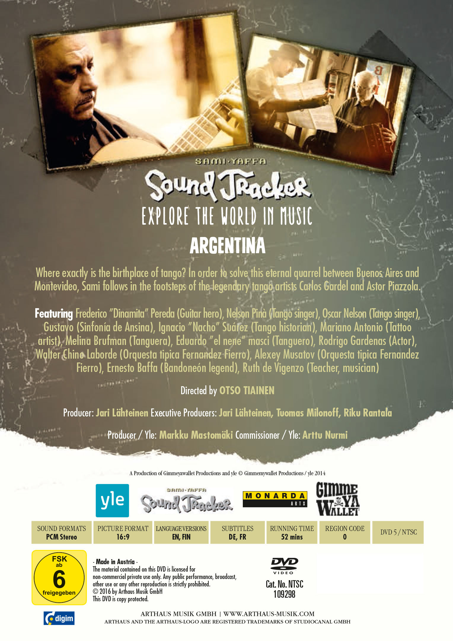 Hallo mein Name ist Sami Yaffa, ich bin Rockmusiker mit einer schier endlosen Neugier und reise seit ich sechzehn bin um die Welt, immer auf der Suche nach neuem Musikalischen. Ich liebe die Musik und tauche ein in unbekannte Kulturen und ihre Klangwelten. Mit diesen Sätzen beginnt die erfolgreiche TV-Serie Sound Tracker aus Finnland. Sami Yaffa, der finnische Bassist und Multiinstrumentalist, begibt sich auf einen musikalischen Road Trip um die Welt - von den USA über Jamaika und Argentinien, der Türkei und Serbien, bis nach Indien und Indonesien. Dabei gilt es die landestypische Musik zu erkunden. Sami beginnt, mit den Einheimischen zu musizieren und ihre Kulturen kennenzulernen. Auch wenn die Musik noch so unterschiedlich sein kann, eines wird deutlich - Musik ist überall, sie verbindet und ist ein wesentlicher Bestandteil unseres Lebens. Wo genau ist der Geburtsort des Tango? Um diesen ewigen Streit zwischen Buenos Aires und Montevideo zu lösen, folgt Sami in Argentinien den Fußstapfen des legendären Tango Künstlers Carlos Gardel und Astor Piazzola.