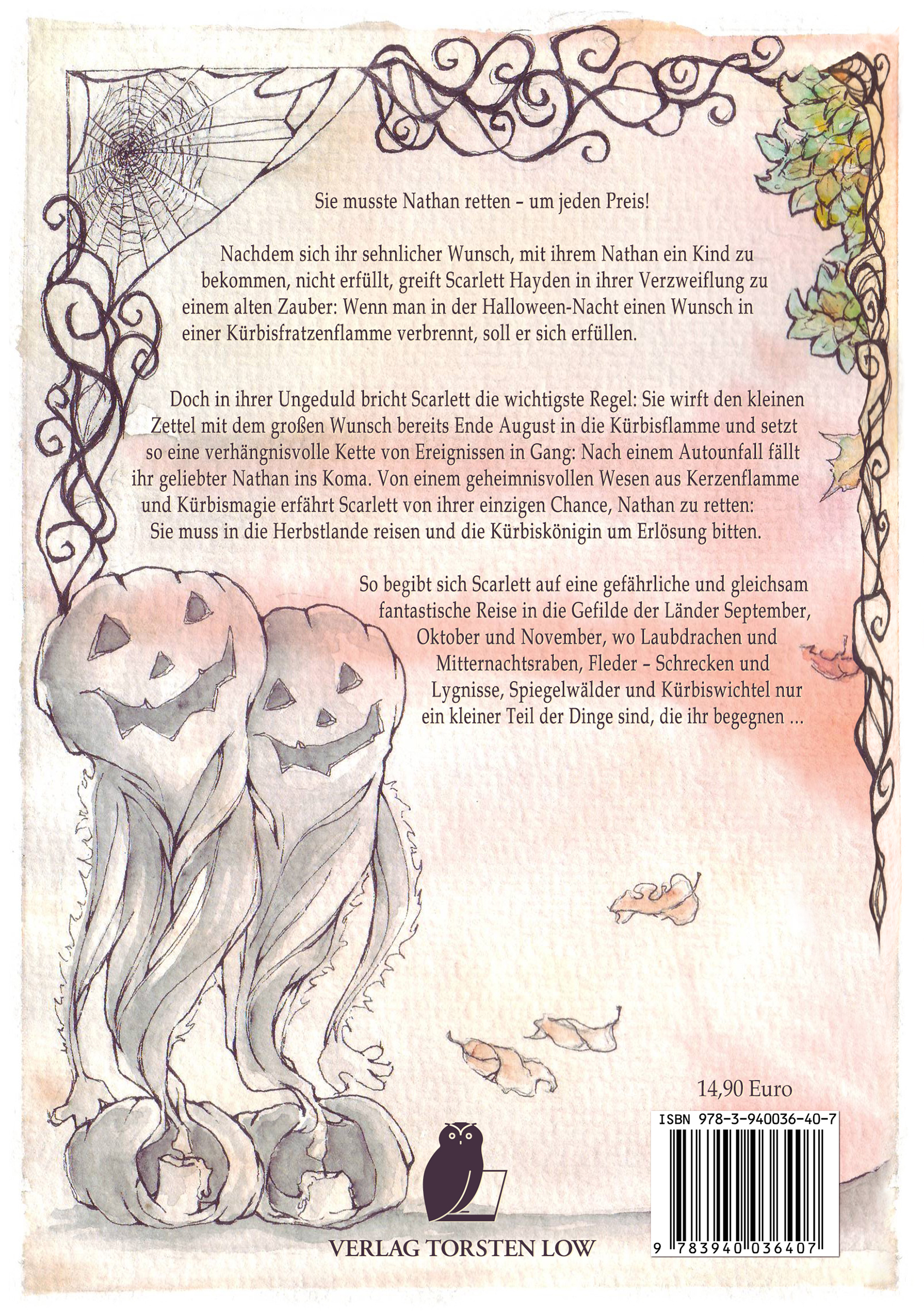 Doch in ihrer Ungeduld bricht Scarlett die wichtigste Regel: Sie wirft den kleinen Zettel mit dem großen Wunsch bereits Ende August in die Kürbisflamme und setzt so eine verhängnisvolle Kette von Ereignissen in Gang: Nach einem Autounfall fällt ihr geliebter Nathan ins Koma. Von einem geheimnisvollen Wesen aus Kerzenflamme und Kürbismagie erfährt Scarlett von ihrer einzigen Chance, Nathan zu retten: Sie muss in die Herbstlande reisen und die Kürbiskönigin um Erlösung bitten.