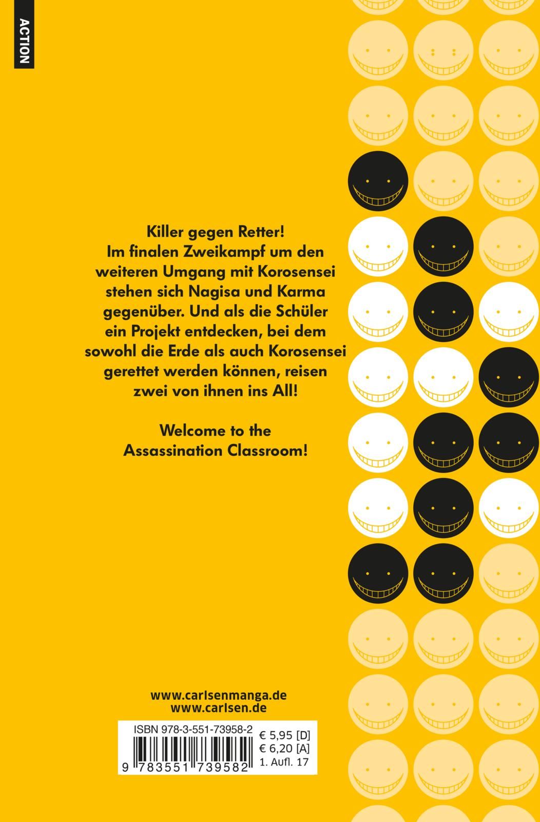 Killer gegen Retter! Im finalen Zweikampf um den weiteren Umgang mit Korosensei stehen sich Nagisa und Karma gegenüber. Und als die Schüler ein Projekt entdecken, bei dem sowohl die Erde als auch Korosensei gerettet werden können, reisen zwei von ihnen ins All!