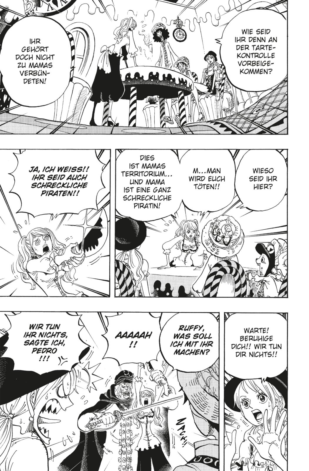 Um Sanji zurückzuholen, wagen sich die Strohhüte ins Reich ihres bislang furchtbarsten Gegners: Big Mom! Unterdessen sieht »Schwarzbein« wehrlos seiner Heirat und damit einem traurigen Schicksal entgegen: Er soll fortan als Mitglied dieser wahrhaft schrecklichen Familie sein Dasein fristen! Das kann Ruffy natürlich keinesfalls zulassen, doch der Weg zum Endgegner ist mit Feinden gepflastert, deren todbringende Macht sich den Freunden erst viel zu spät offenbart...