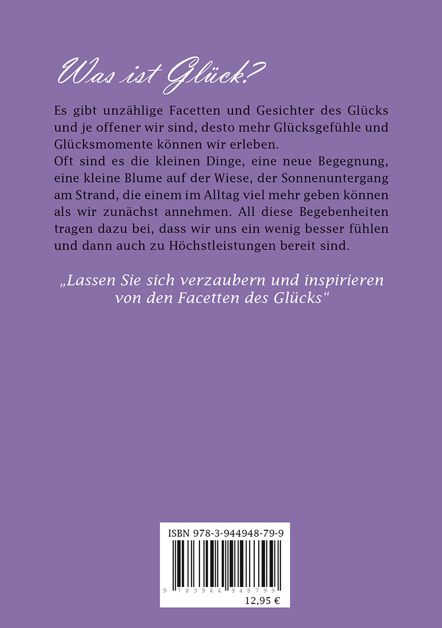 Was ist Glück?Es gibt unzählige Facetten und Gesichter des Glücks und je offener wir sind, desto mehr Glücksgefühle und Glücksmomente können wir erleben.Oft sind es die kleinen Dinge, eine neue Begegnung, eine kleine Blume auf der Wiese, der Sonnenuntergang am Strand, die einem im Alltag viel mehr geben können als wir zunächst annehmen. All diese Begebenheiten tragen dazu bei, dass wir uns ein wenig besser fühlen und dann auch zu Höchstleistungen bereit sind."Lassen Sie sich verzaubern und inspirieren von den Facetten des Glücks"