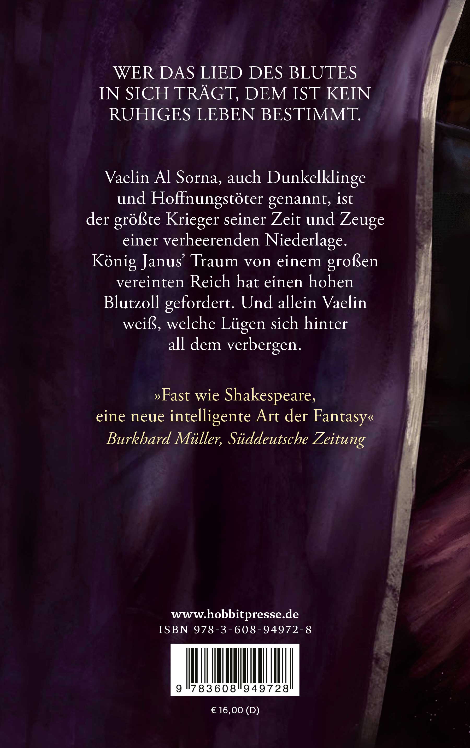 Vaelin al Sorna kehrt aus den Schlachten zurück und die schwere Bürde der Erinnerung lastet auf ihm. Nie wieder will er töten. Zu viele haben in König Janus' Krieg ihr Leben gelassen. Nicht nur, dass er für viele, die überlebt haben, das Ziel ihrer Rachegelüste ist. Zum Turmherrn der Nordlande ernannt, möchte er fern aller Intrigen Ruhe finden. Doch der neue König ist schwach und die Feinde des Reiches schmieden ein Bündnis, das mehr und mehr an Macht gewinnt. Wird Vaelin al Sorna, der das Töten hasst und in seiner Loyalität hin und her gerissen ist, doch wieder zum Schwert greifen?