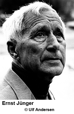 Ernst Jünger, am 29. März 1895 in Heidelberg geboren. 1901–1912 Schüler in Hannover, Schwarzenberg, Braunschweig u. a. 1913 Flucht in die Fremdenlegion, nach sechs Wochen auf Intervention des Vaters entlassen 1914–1918 Kriegsfreiwilliger 1918 Verleihung des Ordens »Pour le Mérite«. 1919–1923 Dienst in der Reichswehr. Veröffentlichung seines Erstlings »In Stahlgewittern«. Studium in Leipzig, 1927 Übersiedlung nach Berlin. Mitarbeit an politischen und literarischen Zeitschriften. 1936–1938 Reisen nach Brasilien und Marokko. »Afrikanische Spiele« und »Das Abenteuerliche Herz«. Übersiedlung nach Überlingen. 1939–1941 im Stab des Militärbefehlshabers Frankreich. 1944 Rückkehr Jüngers aus Paris nach Kirchhorst. 1946–1947 »Der Friede«. 1950 Übersiedlung nach Wilflingen. 1965 Abschluß der zehnbändigen »Werke«. 1966–1981 Reisen. Schiller-Gedächtnispreis. 1982 Goethe-Preis der Stadt Frankfurt/Main.1988 Mit Bundeskanzler Kohl bei den Feierlichkeiten des 25. Jahrestags des Deutsch-Französischen Vertrags. 1993 Mitterrand und Kohl in Wilflingen. 1998 Ernst Jünger stirbt in Riedlingen.