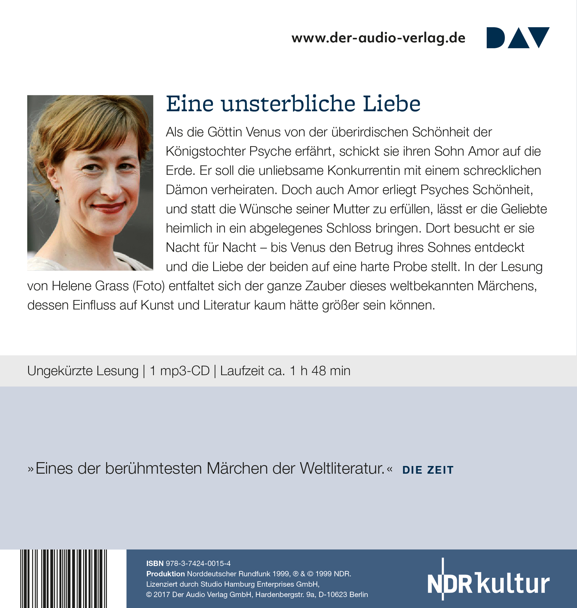 Als die Göttin Venus von der überirdischen Schönheit der Königstochter Psyche erfährt, schickt sie ihren Sohn Amor auf die Erde. Er soll die unliebsame Konkurrentin mit einem schrecklichen Dämon verheiraten. Doch auch Amor erliegt Psyches Schönheit und statt die Wünsche seiner Mutter zu erfüllen, lässt er die Geliebte heimlich in ein abgelegenes Schloss bringen. Dort besucht er sie Nacht für Nacht – bis Venus den Betrug ihres Sohnes entdeckt und die Liebe der beiden auf eine harte Probe stellt. In der Lesung von Helene Grass entfaltet sich der ganze Zauber dieses weltbekannten Märchens, dessen Einfluss auf Kunst und Literatur kaum hätte größer sein können.