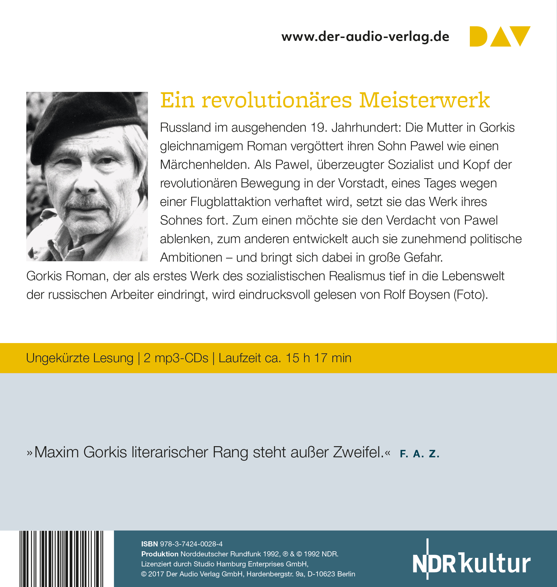 | Schlagworte | Agitation • Anarchie • Arbeiterbewegung • Familienleben • Hörbuch; Literaturlesung • Klassische Belletristik • Marxismus • Mutter-Sohn-Beziehung • Proletariat • Revolution • Russland • Zar |
