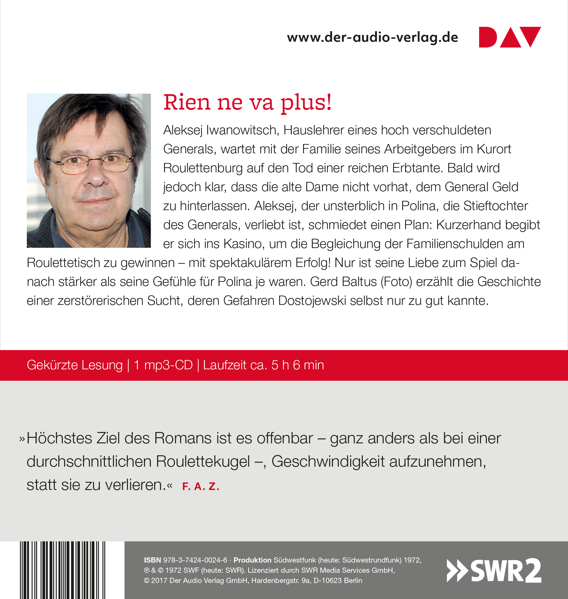 | Schlagworte | Baden-Baden • Belletristik: Themen, Stoffe, Motive: Soziales • Casino • Der Doppelgänger • Der Idiot • Hörbuch; Literaturlesung • Klassiker • Klassische Belletristik • Meisterwerk • Roulette • Russische Literatur • Russland • Schuld und Sühne • Spielsucht |