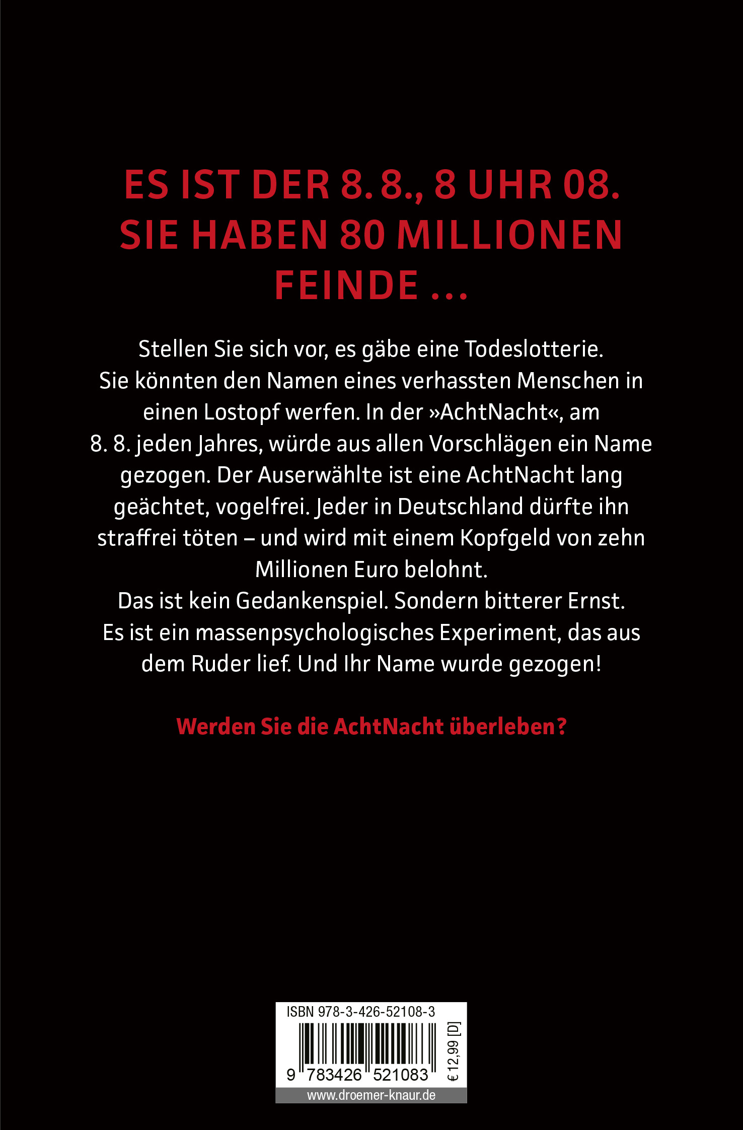 Stell dir vor, es gibt eine Todeslotterie. Du kannst den Namen eines verhassten Menschen in einen Lostopf werfen. In der "AchtNacht", am 8. 8. jedes Jahres, wird aus allen Vorschlägen ein Name gezogen. Der Auserwählte ist eine AchtNacht lang geächtet, vogelfrei. Jeder in Deutschland darf ihn straffrei töten - und wird mit einem Kopfgeld von zehn Millionen Euro belohnt.