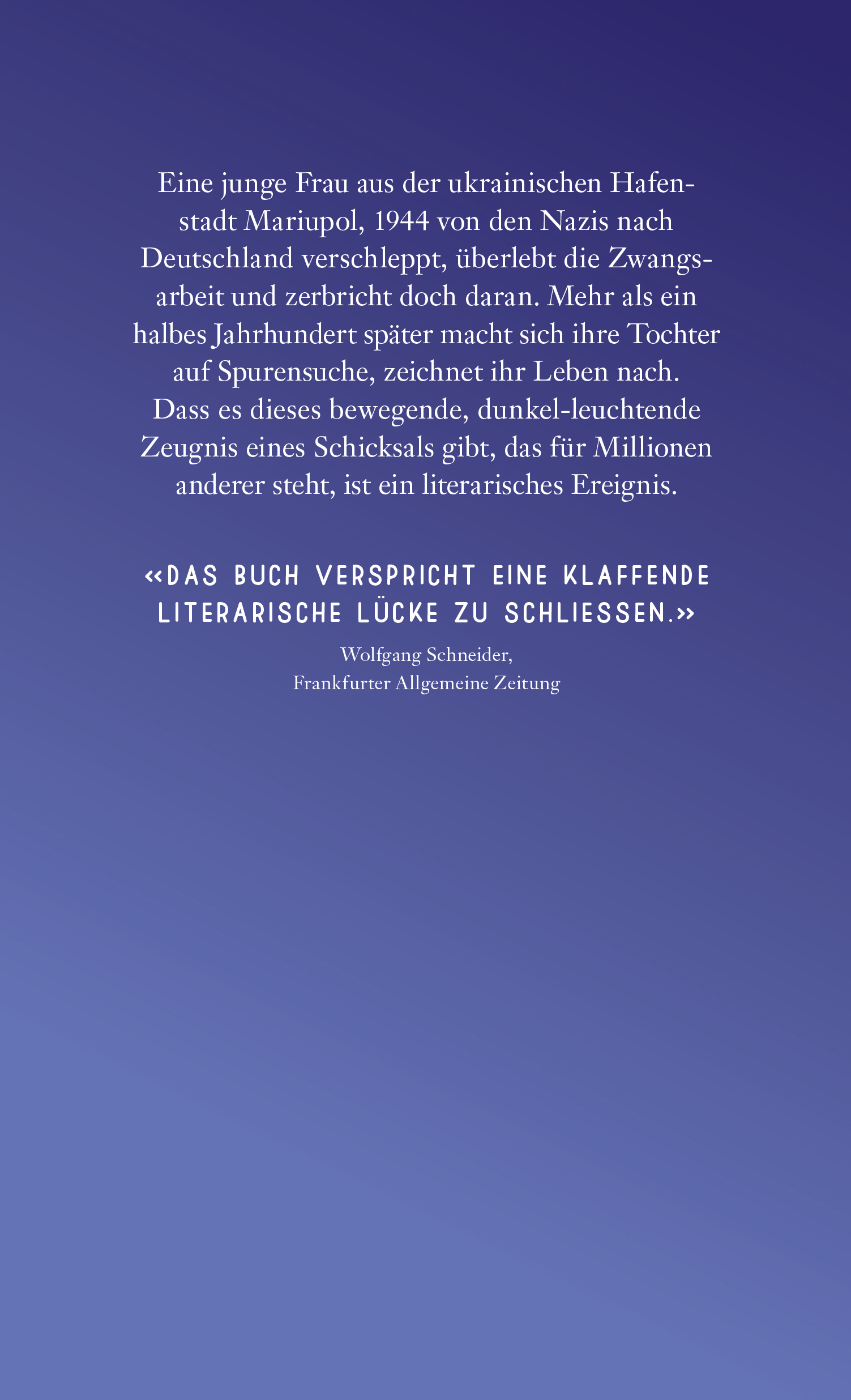 | Schlagworte | Arbeitslager • Deutschland • Familiensaga • Faschismus • Franken • Fürth • Holocaust • mariupol • Preis der Leipziger Buchmesse; Belletristik • Russland • Stalinismus • Trauer; Erfahrungsberichte • Trauer; Romane/Erzählungen • Ukraine • Ukraine, Geschichte; Biografien • Ukraine, Geschichte; Romane/Erzähl. • Verlust (Psychologie); Romane/Erzählungen • Zwangsarbeit • Zwangsarbeit (Nationalsozialismus); Berichte/Erinnerungen • Zwangsarbeit (Nationalsozialismus); Romane/Erzählungen |
