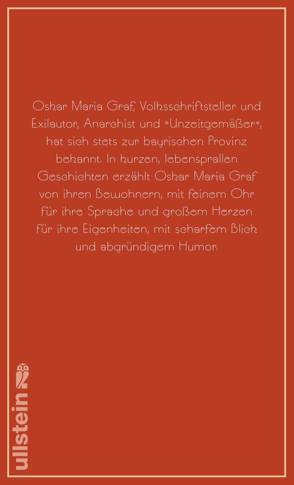 Im Juni 2017 jährt sich der Todestag des großen "Volksschriftstellers" Oskar Maria Graf zum fünfzigsten Mal. Anlass genug, diese sehr besondere Sammlung einer breiteren Öffentlichkeit wieder zugänglich zu machen, Geschichten aus dem prallen bayerischen Leben, die den Leser nur für wenige Minuten in Anspruch nehmen. In diesen Miniaturen ist trotz ihrer Kürze alles enthalten, was den Erzähler Graf auszeichnet: Heiterer Witz und grotesker Humor, melancholische Pastelle und Porträts von Sonderlingen, sozialkritische Studien und politische Satiren. Oskar Maria Graf erzählt von der Provinz und ihren Bewohnern, mit feinem Ohr für ihre Sprache und großem Herz für ihre Eigenheiten, mit scharfem Blick und zuweilen beißendem Humor. Ergänzt wird die Sammlung durch ein ausführliches Nachwort. Wilfried F. Schoeller, Herausgeber der Werkausgabe, bringt Oskar Maria Graf, Volksschriftsteller und Exilautor, Anarchist und "Unzeitgemäßen", in Leben und Werk dem heutigen Leser nahe.