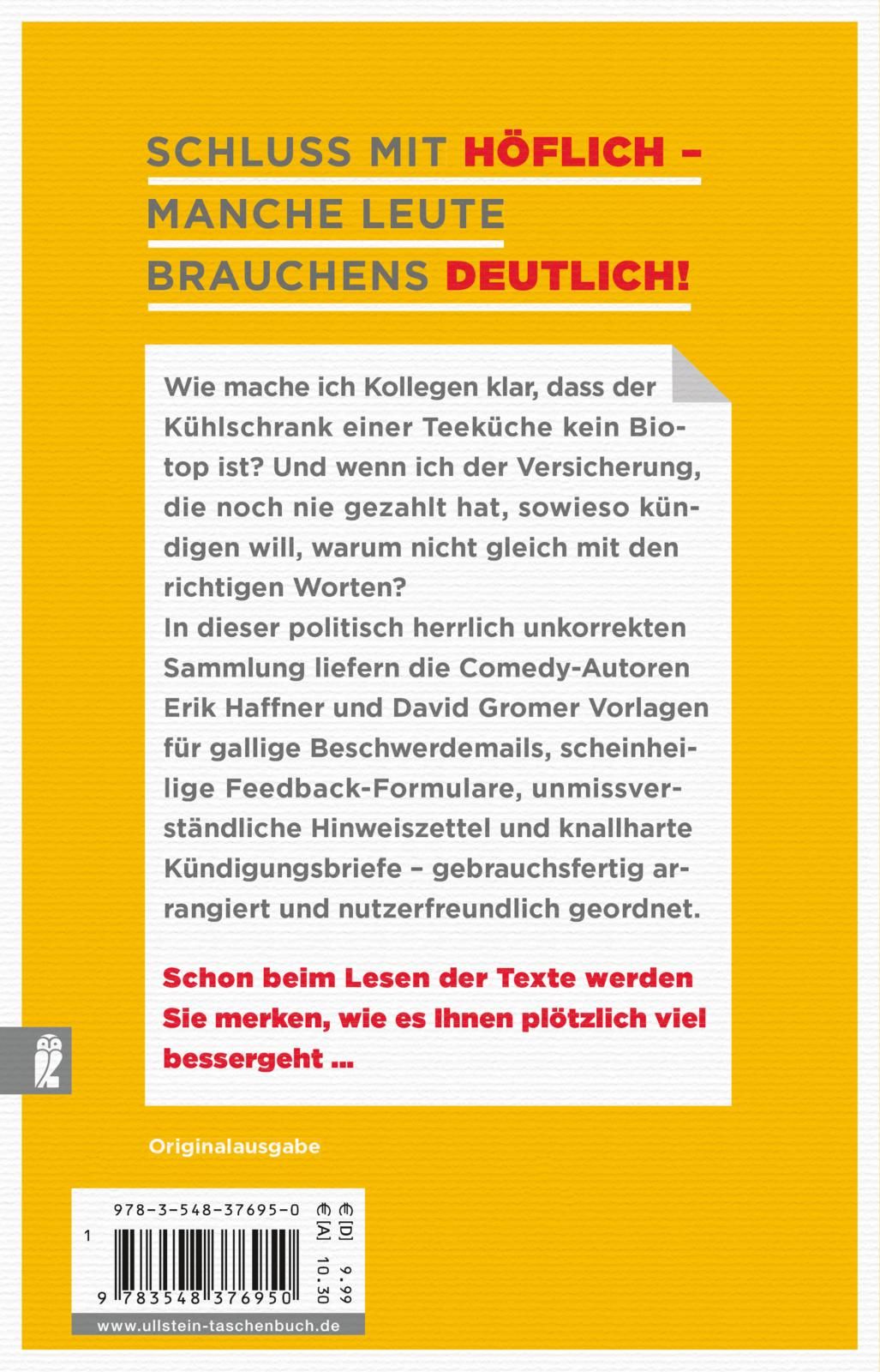 Wie beschwere ich mich am eindrücklichsten beim Vermieter, der meine überteuerte Bruchbude nicht renovieren will? Wie mache ich Kollegen klar, dass der Kühlschrank einer Teeküche kein Biotop ist? In dieser politisch herrlich unkorrekten Sammlung liefern die Comedy-Autoren Erik Haffner und David Gromer Anregungen und Vorlagen für alle Arten von Beschwerdemails, Absage-Nachrichten und Kündigungsbriefen. Schon beim Lesen werden Sie merken, wie es Ihnen plötzlich viel besser geht ...