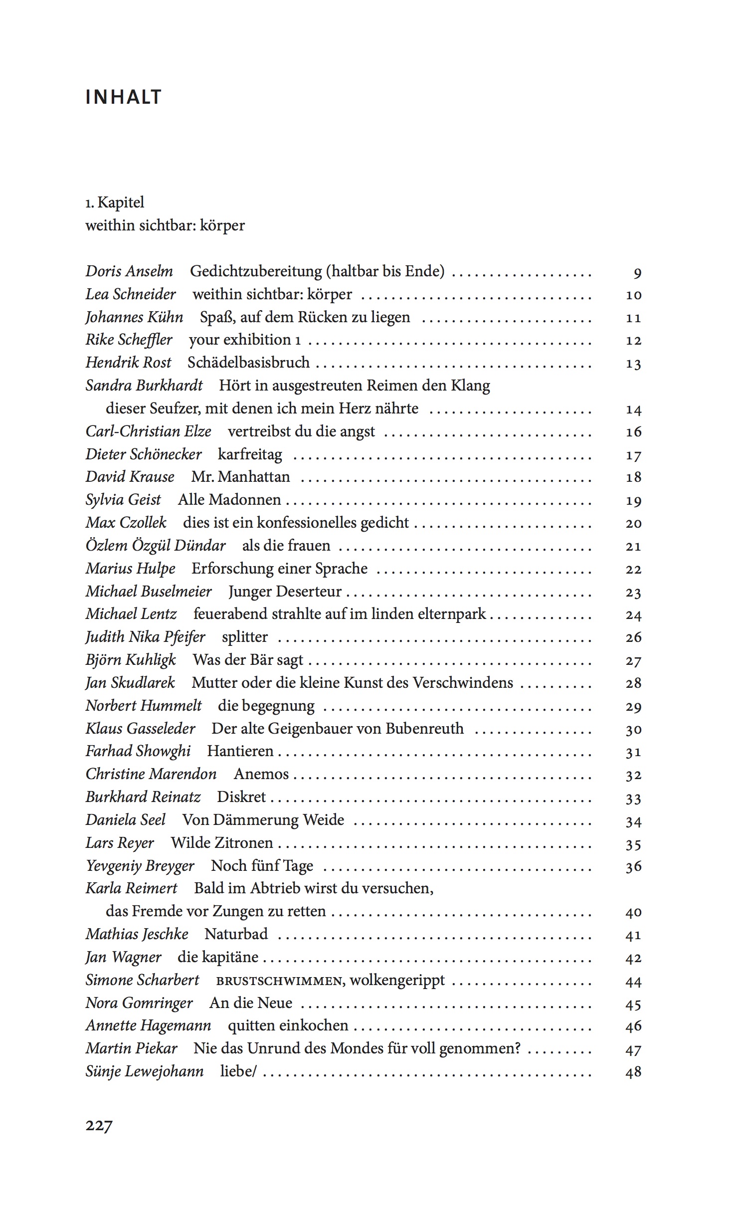 | Schlagworte | Anne Dorn • Anthologie • Bildgedicht • Björn Kuhligk • Carolin Callies • Crauss. • Daniela Seel • Deutsche Literatur; Lyriksammlungen • Ernest Wichner • Friederike Mayröcker • Gegenwart • Herta Müller • Jan Wagner • Lutz Seiler • Lydia Daher • Lyrik • Lyriksammlung / Lyrikanthologie • Margarete Stokowski • Mirko Bonné • nora gomringer • Sammlung |
