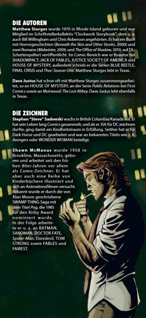 Matthew Sturges wurde 1970 in Rhode Island geboren und war Mitglied im Schriftstellerkollektiv “Clockwork Storybook”, dem u. a. auch Bill Willingham und Chris Roberson angehörten. Er hat ein Buch mit Horrorgeschichten (Beneath the Skin and Other Stories, 2000) und zwei Romane (Midwinter, 2009, und The Office of Shadow, 2010, auf Dt.: Schattenspäher) veröffentlicht. Im Comic-Bereich war er Koautor bei SHADOWPACT, JACK OF FABLES, JUSTICE SOCIETY OF AMERICA und HOUSE OF MYSTERY, außerdem schrieb er die Serien BLUE BEETLE, FINAL CRISIS und Thor: Season One. Matthew Sturges lebt in Texas. Dave Justus hat schon oft mit Matthew Sturges zusammengearbeitet, so an HOUSE OF MYSTERY, an der Serie Public Relations bei First Comics sowie an Muirwood: The Lost Abbey. Dave Justus lebt ebenfalls in Texas. DIE ZEICHNER Stephen “Steve” Sadowski wuchs in British Columbia/Kanada auf. Er hat sein Leben lang Comics gesammelt, und als er JSA für DC zeichnen durfte, ging damit ein Kindheitstraum in Erfüllung. Seither hat er für Dark Horse und DC gearbeitet und war an bekannten Titeln wie z. B. Avengers oder WONDER WOMAN beteiligt. Shawn McManus wurde 1958 in Brookline, Massachusetts, geboren und arbeitet seit den frühen 80er-Jahren vor allem als Comic-Zeichner. Er hat aber auch eine Reihe von Kinderbüchern illustriert und sich an Animationsfilmen versucht. Bekannt wurde er durch die von Alan Moore geschriebene SWAMP THING-Saga mit dem Titel Pog, die 1985 für den Kirby Award nominiert wurde. In der Folge arbeitete er u. a. an BATMAN, SANDMAN, DOCTOR FATE, Spider-Man, Daredevil, TOM STRONG sowie FABLES und FAIREST
