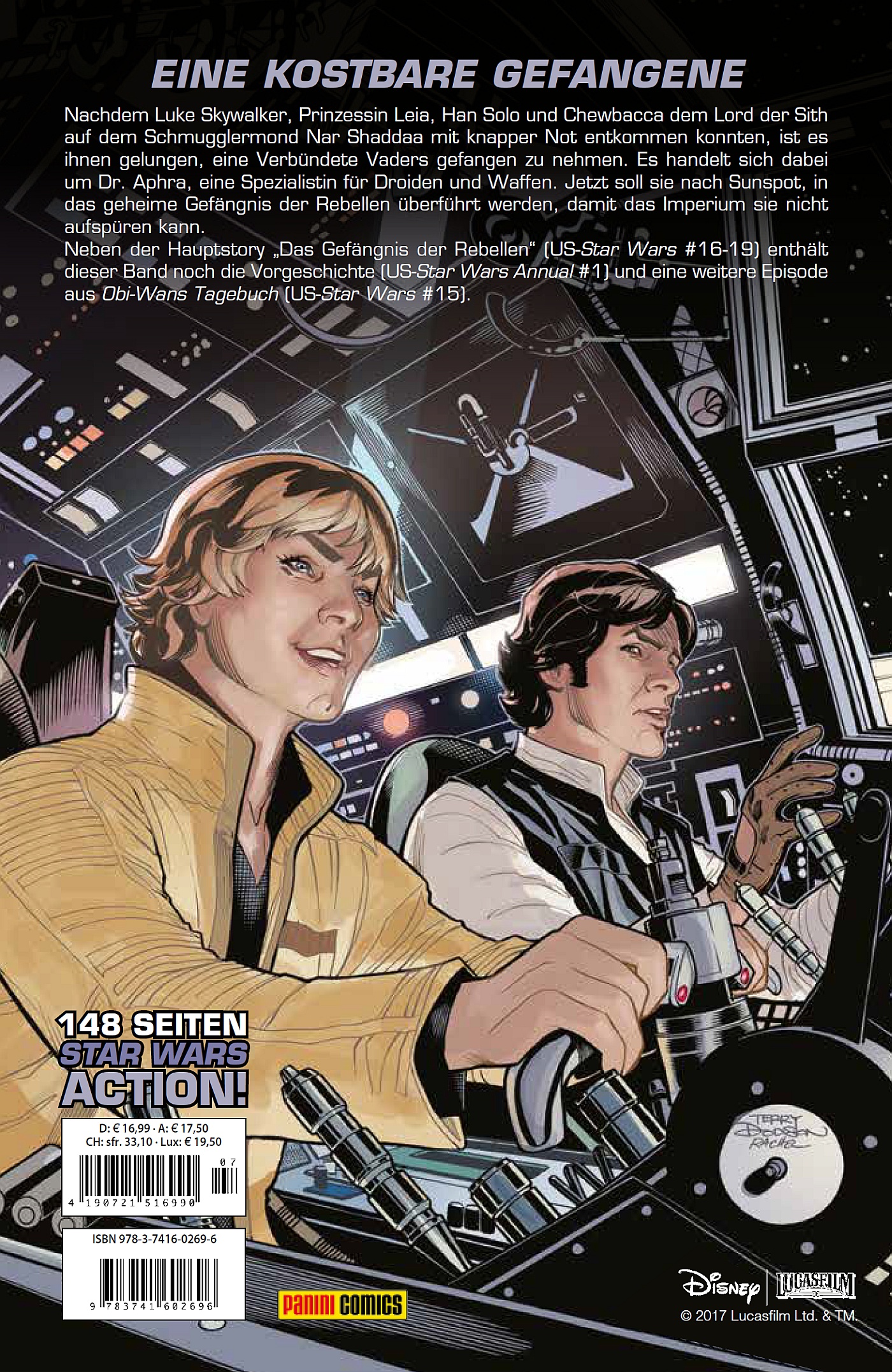 EINE KOSTBARE GEFANGENENachdem Luke Skywalker, Prinzessin Leia, Han Solo und Chewbacca dem Lord der Sith auf dem Schmugglermond Nar Shaddaa mit knapper Not entkommen konnten, ist es ihnen gelungen, eine Verbündete Vaders gefangen zu nehmen. Es handelt sich dabei um Dr. Aphra, eine Spezialistin für Droiden und Waffen. Jetzt soll sie nach Sunspot, in das geheime Gefängnis der Rebellen überführt werden, damit das Imperium sie nicht aufspüren kann.Neben der Hauptstory "Das Gefängnis der Rebellen" (US-Star Wars #16-19) enthält dieser Band noch die Vorgeschichte (US-Star Wars Annual #1) und eine weitere Episode aus Obi-Wans Tagebuch (US-Star Wars #15).
