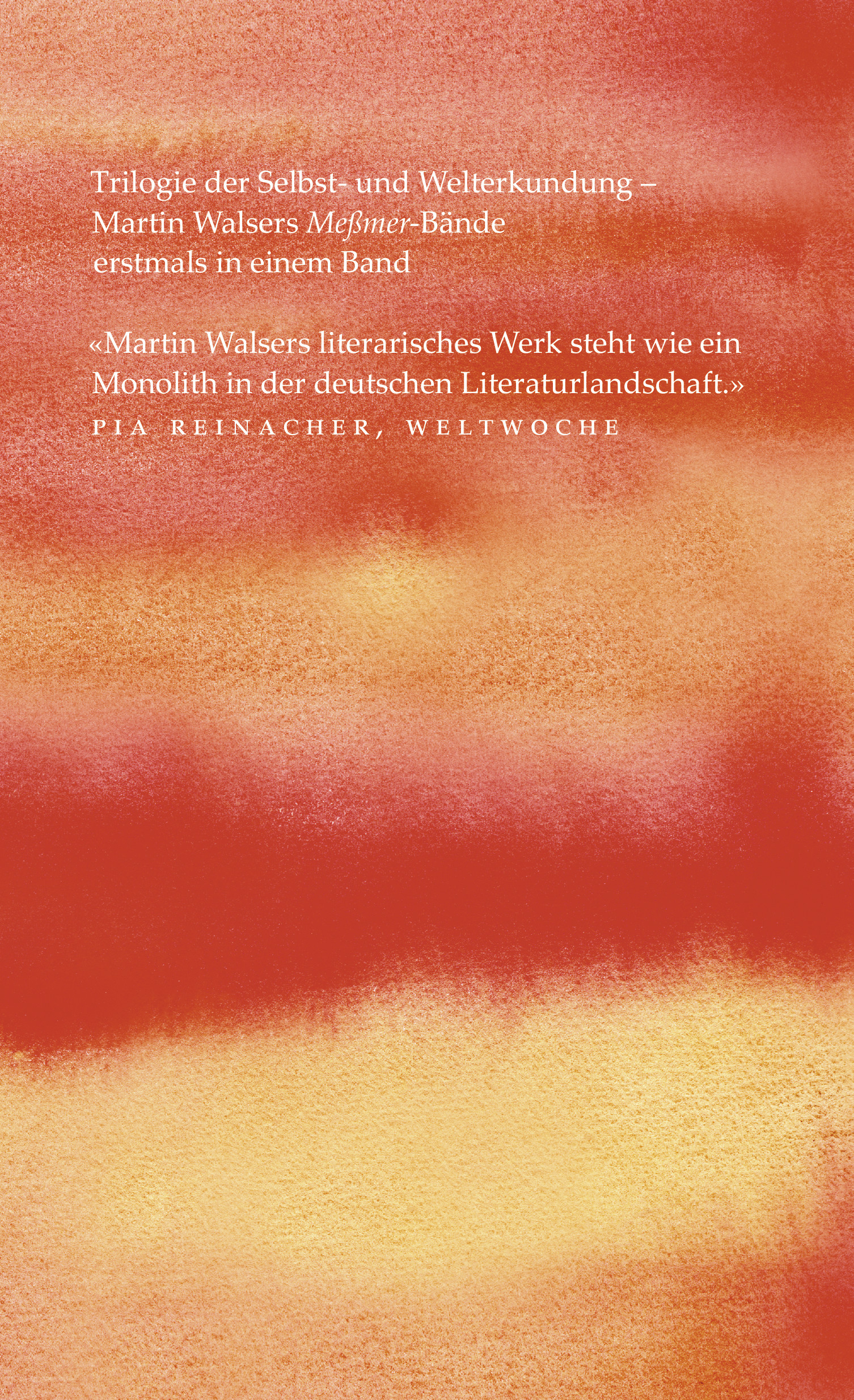 Meßmer, sozusagen Martin Walsers innerste Autobiografie, zeigt ein Ich im Widerstreit zwischen Selbst- und Welterkundung, Wunsch und Wirklichkeit, Maskerade und schonungsloser Offenheit: sprach- und erkenntnissüchtig, stolz und resignierend. Je dunkler seine Stimmung, desto heller leuchtet, was dieser Meßmer durchs In-Worte-Kleiden daraus macht: Jedes Risiko birgt eine Schönheitschance.