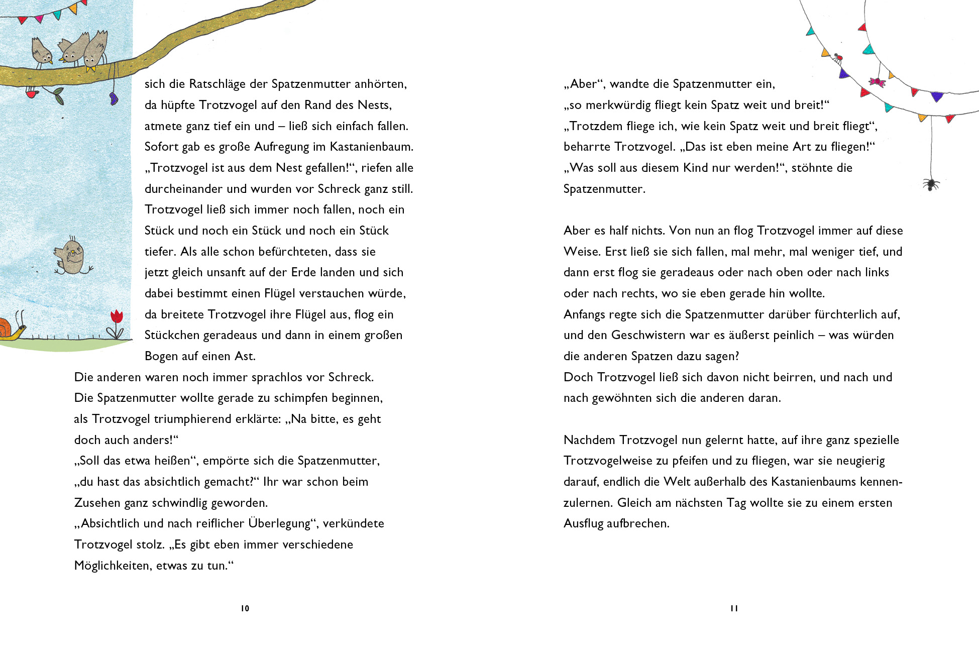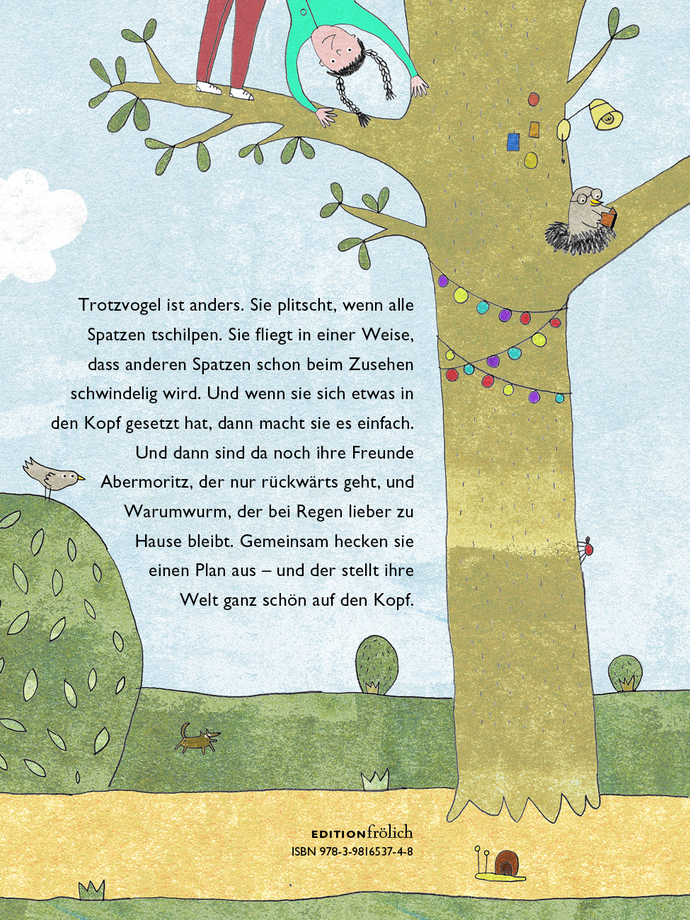 Trotzvogel ist anders. Sie plitscht, wenn alle Spatzen tschilpen. Sie fliegt in einer Weise, dass anderen Spatzen schon beim Zusehen schwindelig wird. Und wenn sie sich etwas in den Kopf gesetzt hat, dann macht sie es einfach. Und dann sind da noch ihre Freunde Abermoritz, der nur rückwärts geht, und Warumwurm, der bei Regen lieber zu Hause bleibt. Gemeinsam hecken sie einen Plan aus - und der stellt ihre Welt ganz schön auf den Kopf.