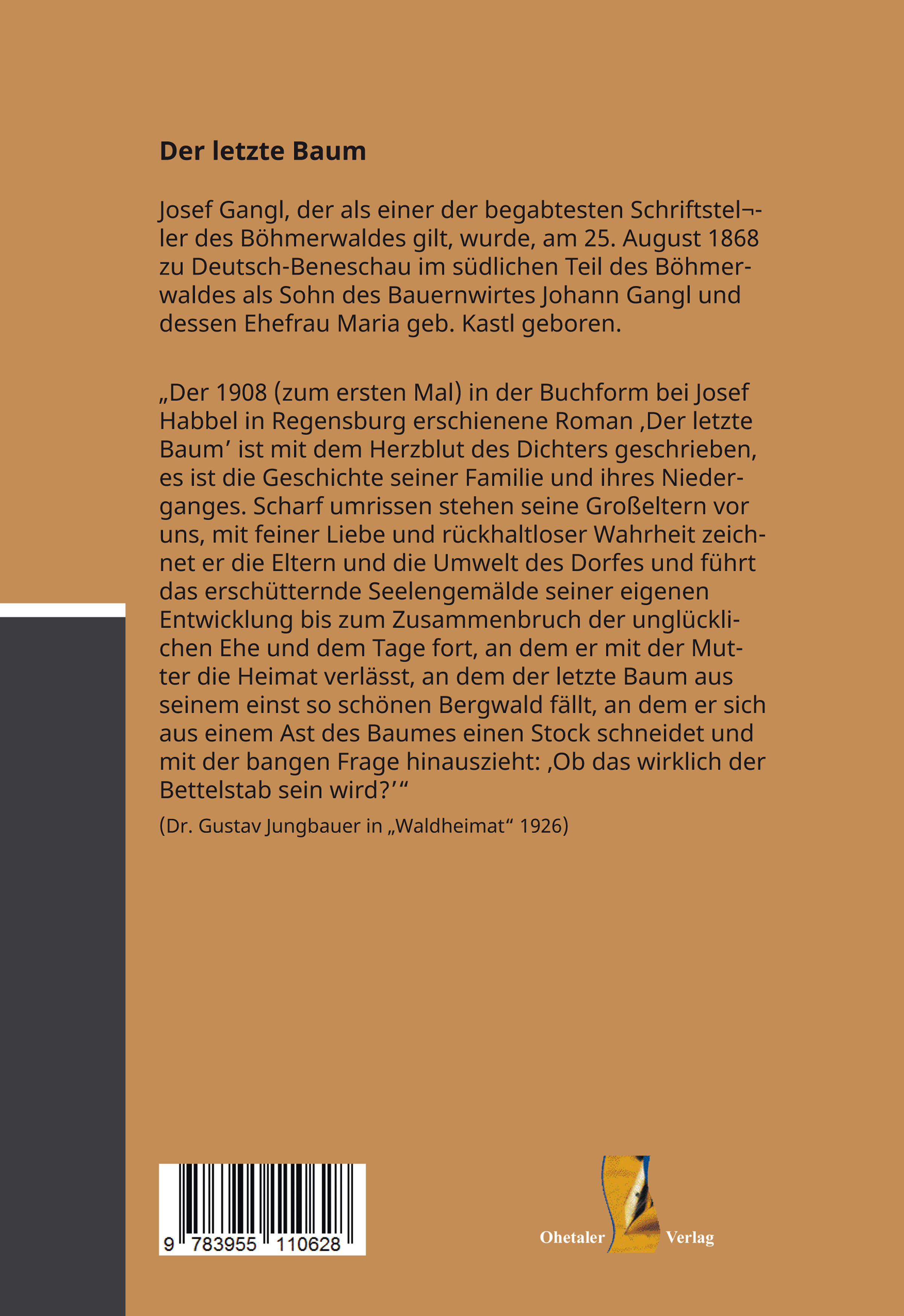 | Schlagworte | Adolf Weishäupl • Belletristik und verwandte Gebiete • Böhmerwald • Böhmerwald; Romane/Erzählungen • Der letzte Baum • Erzählung • Josef Gangl • vergessene Böhmerwaldschriftsteller |