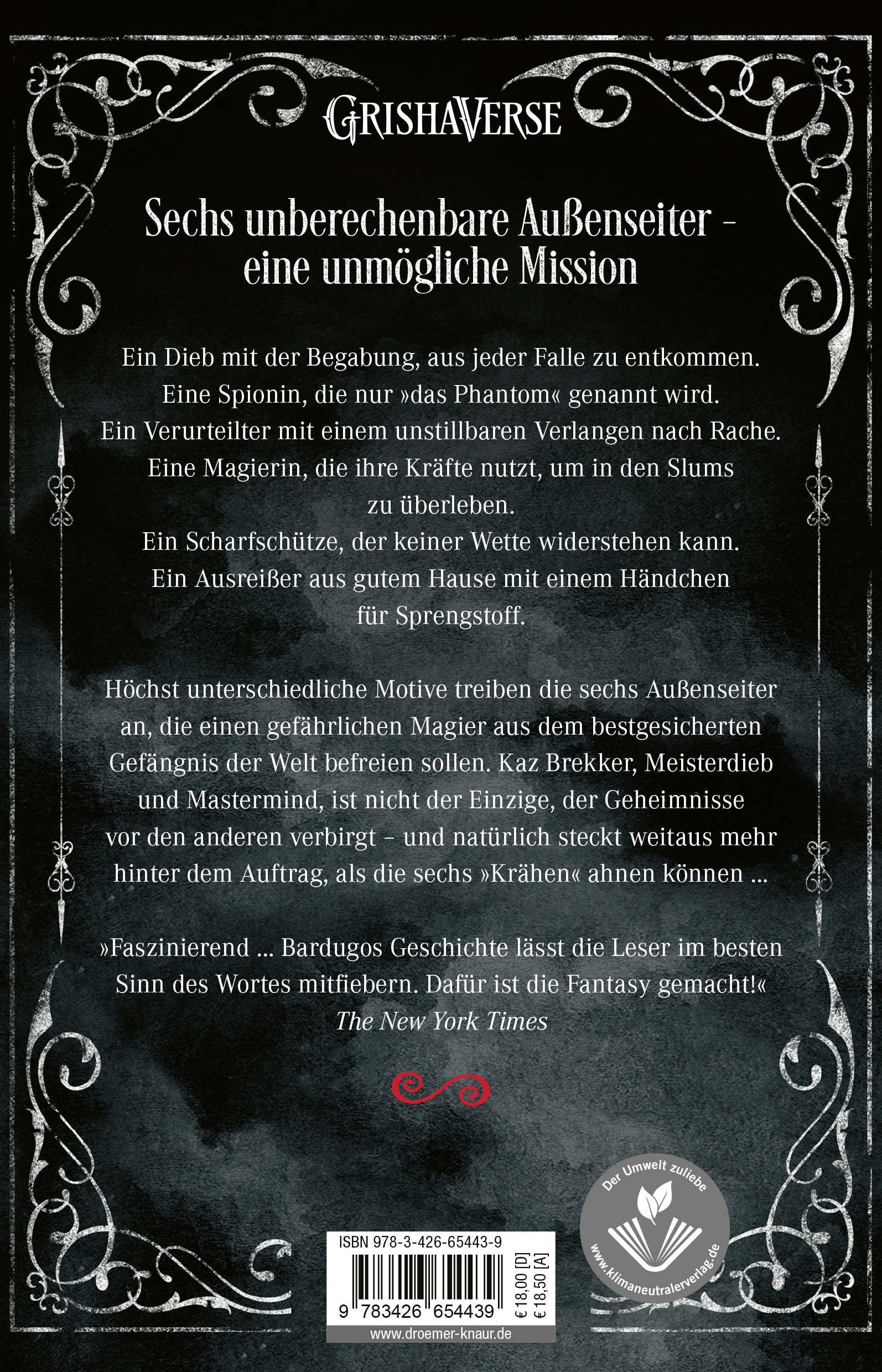 Ketterdam - pulsierende Hafenstadt, Handelsmetropole, Tummelplatz zwielichtiger Gestalten: Hier hat sich Kaz Brekker zur gerissenen und skrupellosen rechten Hand eines Bandenchefs hochgearbeitet. Als er eines Tages ein Jobangebot erhält, das ihm unermesslichen Reichtum bescheren würde, weiß Kaz zwei Dinge: Erstens wird dieses Geld den Tod seines Bruders rächen. Zweitens kann er den Job unmöglich allein erledigen ...