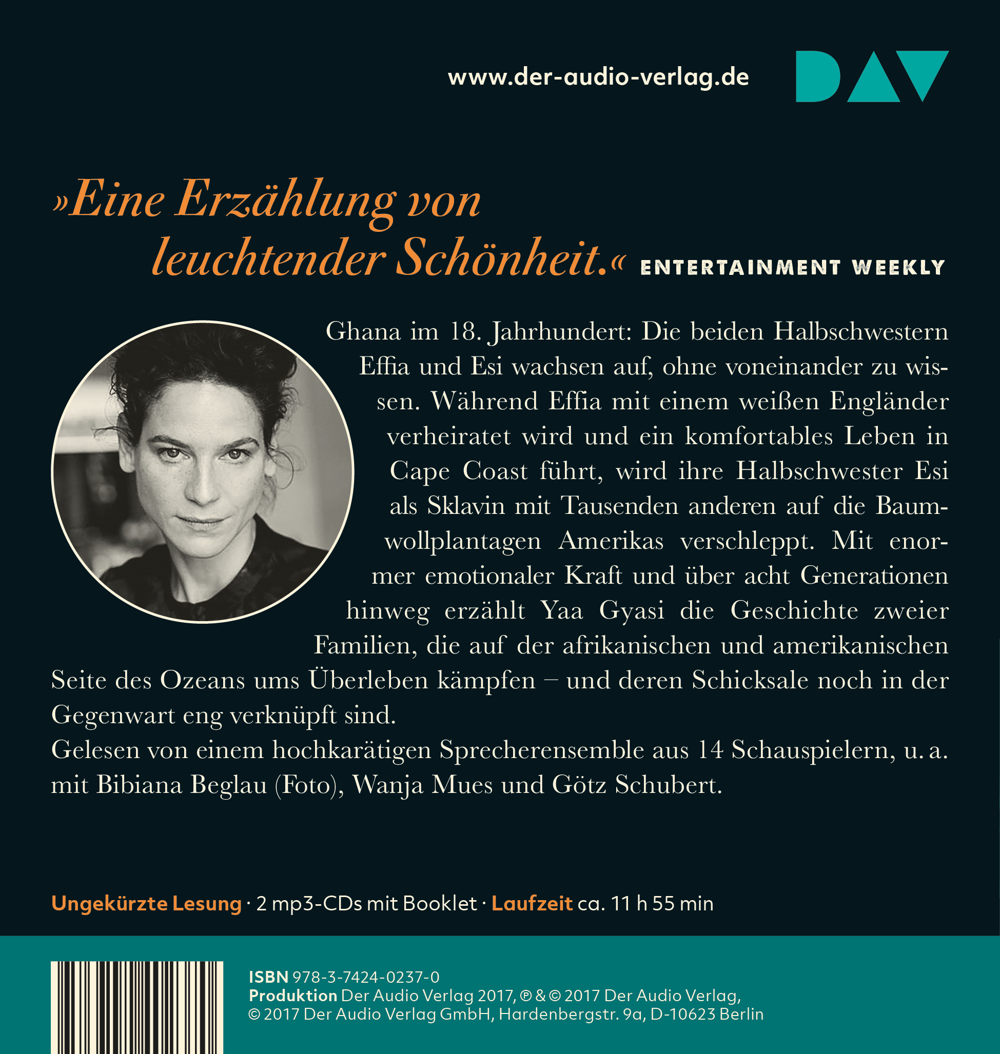 | Schlagworte | Abschaffung Sklaverei • Afrikanische Geschichte • Americanah • Amerikanische Geschichte • Chimamanda Ngozi Adichie • Familie • Familiensaga • Generationenromane, Familiensagas • Ghana • Ghana, Geschichte; Romane/Erzählungen • Ghana, Geschichte; Romane/Erzählungen • Harper Lee • Hörbuch; Historische Romane/Erzählungen • Hörbuch; Literaturlesung • Hörbuch; Historische Romane/Erzählungen • Hörbuch; Literaturlesung • Moderne und zeitgenössische Belletristik • Sklavenhandel • Sklaverei; Romane/Erzählungen • Sklaverei; Romane/Erzählungen • Sklaverei und Abschaffung der Sklaverei • Südstaaten USA • Südstaaten USA • Taiye Selasi • Vereinigte Staaten von Amerika, USA • Wer die Nachtigall stört • Wer die Nachtigall stört |