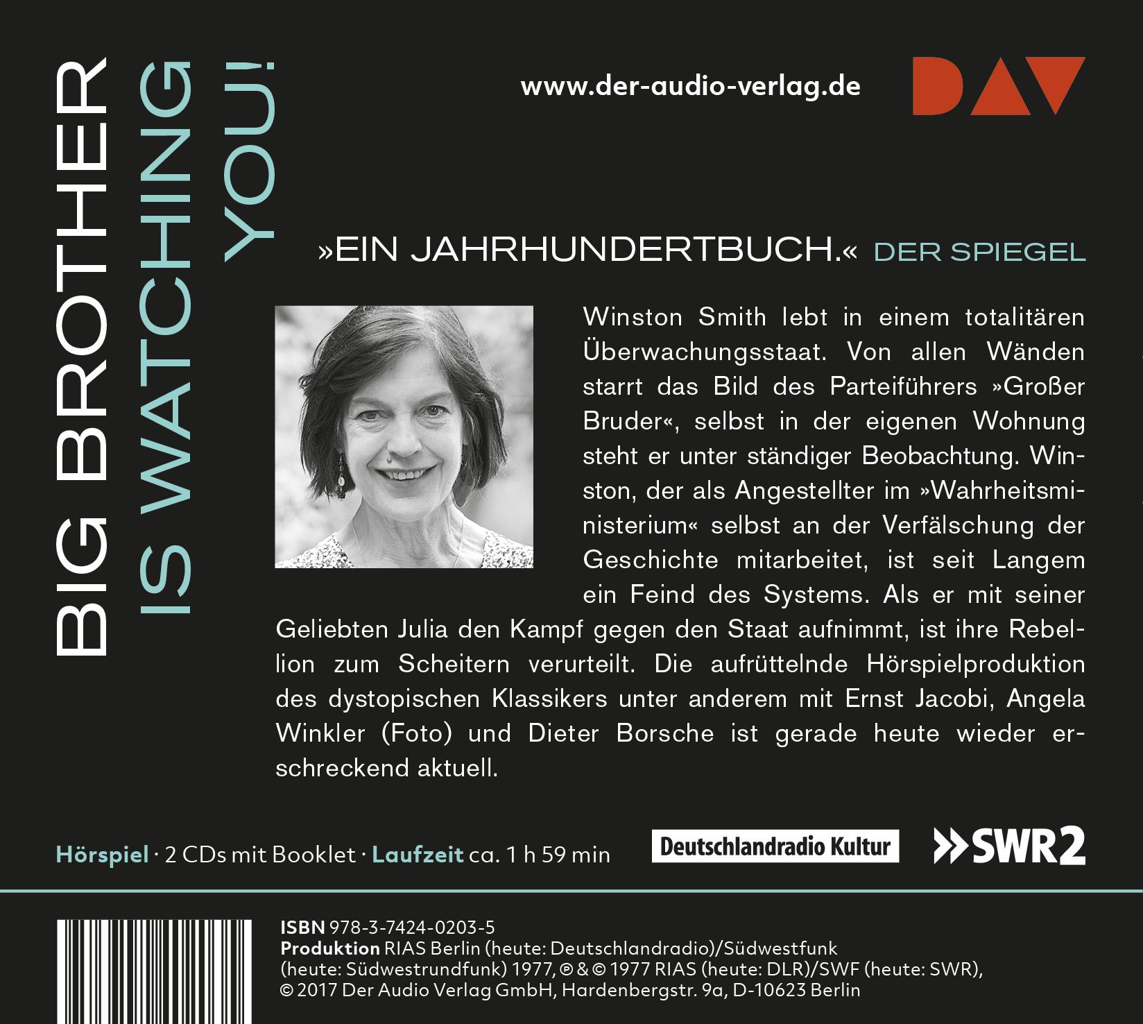 | Schlagworte | Aldous Huxley • Alternativweltgeschichten • Belletristik: Themen, Stoffe, Motive: Politik • Belletristik: Themen, Stoffe, Motive: Soziales • Big Brother • Dystopie • Dystopie; Romane/Erzählungen • Dystopie; Roman/Erzählung • Dystopie; Roman/Erzählung • Dystopische & utopische Literatur • Dystopische & utopische Literatur • Farm der Tiere • Futurismus • Großer Bruder • Großer Bruder • Hörbuch; Science Fiction-Hörspiel • Hörbuch; Science Fiction-Hörspiel • Neusprech • Ozeanien • Politische Ideologien • Schöne neue Welt • Schöne neue Welt • Überwachung • Überwachungsstaat • Utopie • Überwachung • Überwachungsstaat • Vereinigte Staaten von Amerika, USA • Wahrheitsministerium |