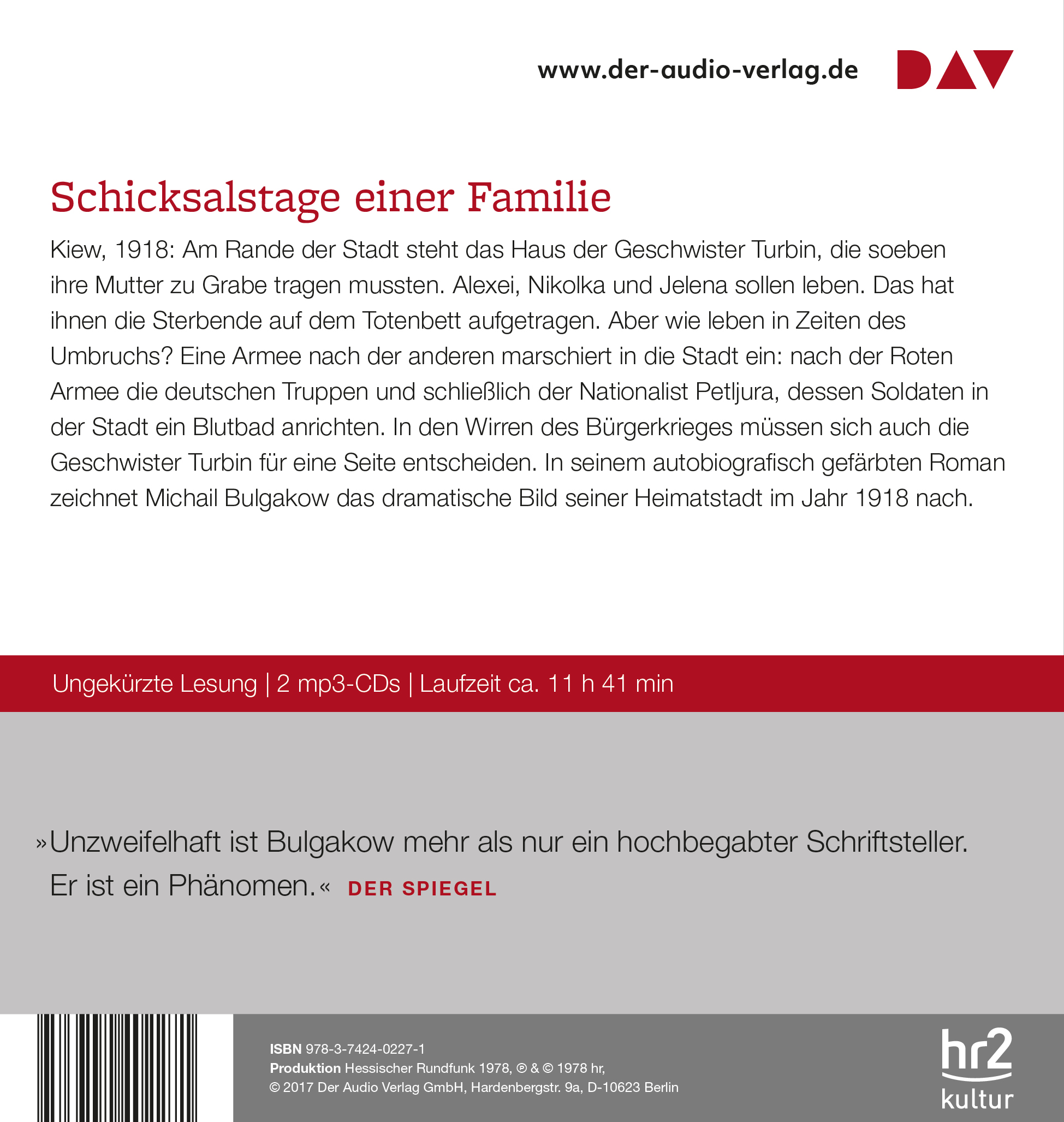| Schlagworte | bolschewiken • Familie • Familienleben • Geschwister • Historischer Roman • Hörbuch; Historische Romane/Erzählungen • Hörbuch; Literaturlesung • Klassische Belletristik • Kommunisten • Meister und Magarita • Revolution • Russland • Russland, Geschichte; Romane/Erzählungen • Ukaine • Ukraine • Weiße Garde • Zar |