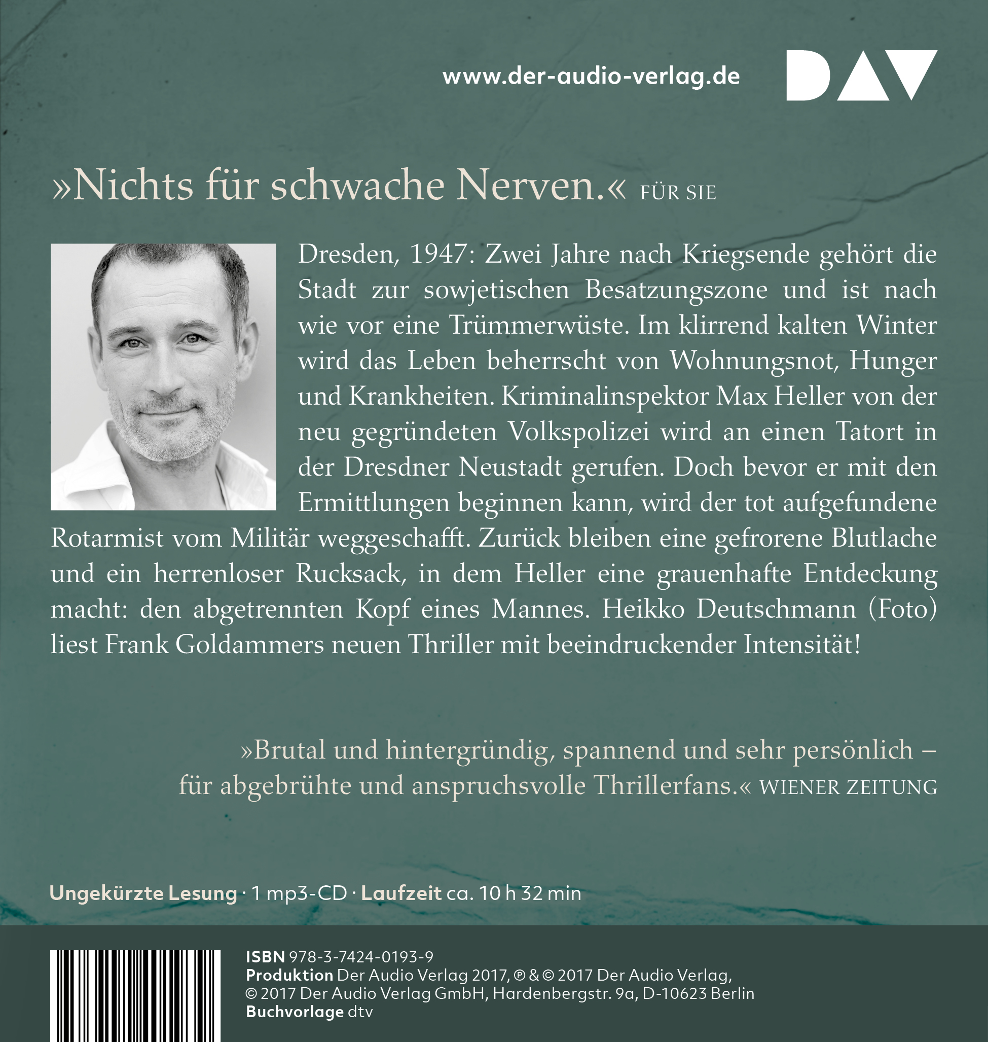 | Schlagworte | 2. Fall • Angstmann • Bestseller • DDR • Dresden • Dresden, Geschichte; Krimis/Thriller • Historische Kriminalromane • historischer Krimi • Hörbuch; Krimis/Thriller-Lesung • Max Heller • Nachkriegszeit • Ostdeutschland • Sowjetisch Besetzte Zone • Susanne Goga • Thriller • Thriller / Spannung • Volker Kutscher • Zweiter Weltkrieg |