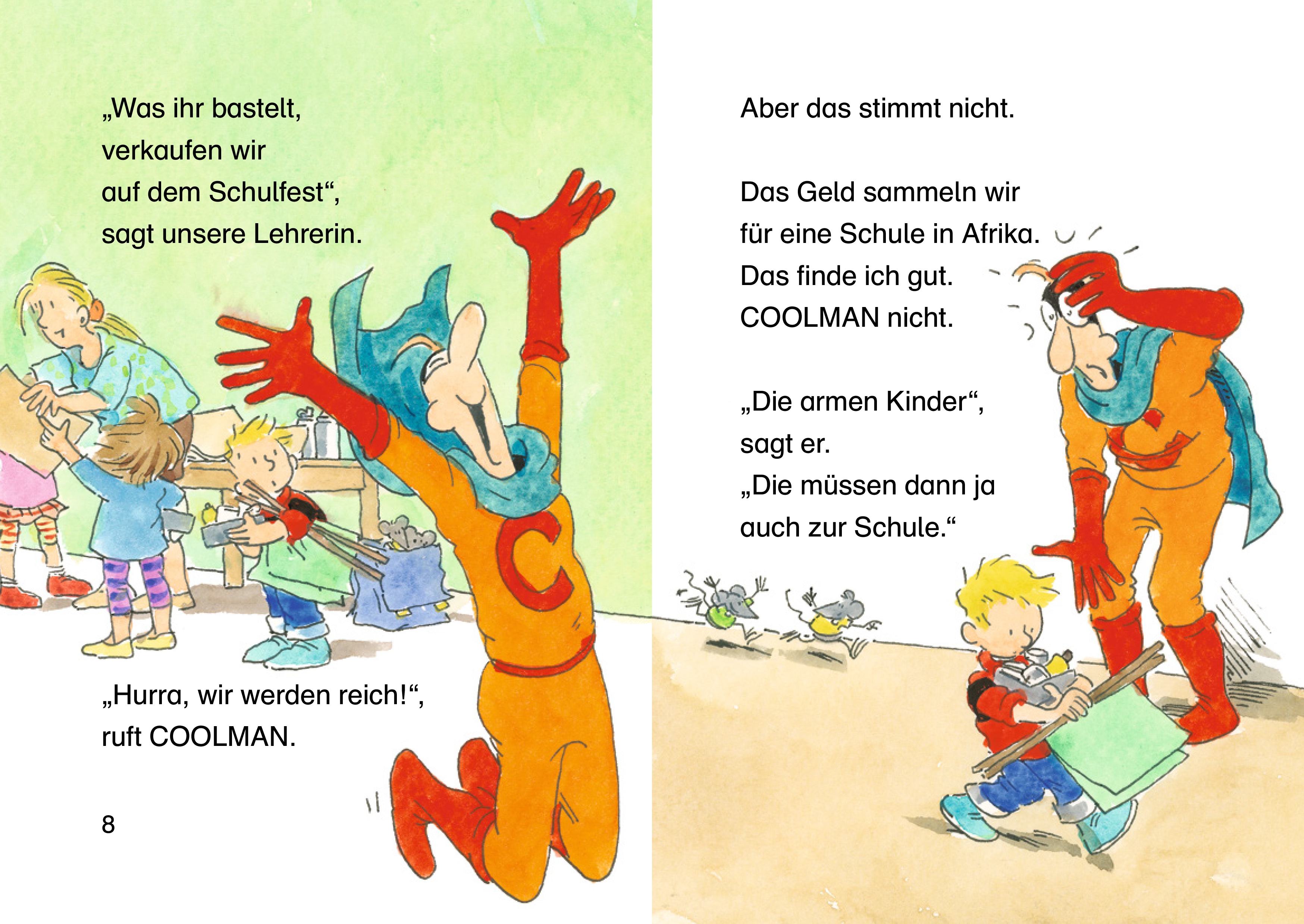 Kais Klasse bastelt für den Schulbasar. Finn und Kai versuchen sich zuerst an einem Drachen. Klar, dass Coolman sich einmischt und alles besser weiß. Sein Drachen ist ein gefährliches, feuerspuckendes Wesen und fliegt natürlich am höchsten. Der Drachen der beiden Jungs erinnert an einen grünen Elefanten, und der schwebt ihnen auch noch davon. Dann versuchen sie es eben mit Kastanienmännchen! Coolman überredet sie, stattdessen fiese Monster zu basteln. Und die entpuppen sich beim Basar als Verkaufsschlager! Ein Riesenspaß für alle Grundschulstufen, nicht nur, aber auch und sogar für lesefaule Jungs.