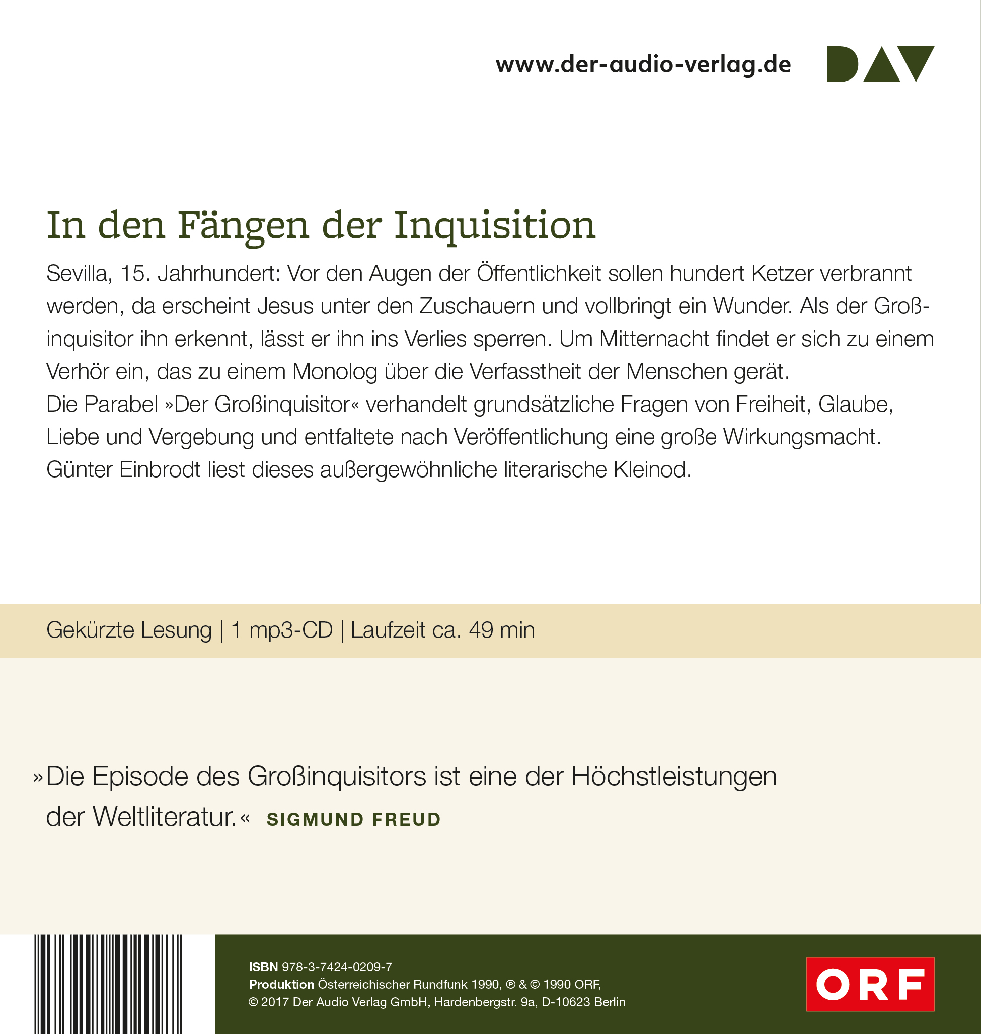 »Die Episode des Großinquisitors ist eine der Höchstleistungen der Weltliteratur.« SIGMUND FREUD »Es gibt keinen Zweifel: Wer sich eine Bibliothek mit Weltliteratur in Form von Hörbüchern aufbauen möchte, kommt an dieser Edition nicht vorbei.« WDR 3 »Hier wird fündig, wer an Hörbuchproduktionen Freude hat, die nicht schnell hingeschludert sind, sondern mit einer Regie-Idee zum Text vom und für den Rundfunk produziert sind.« NDR KULTUR »Mehr Zeit hätte man ja immer gern, aber für diese schönen Hörbücher [...] besonders.« WAZ »Die Hörbuch-Edition 'Große Werke. Große Stimmen.' umfasst herausragende Lesungen deutschsprachiger Sprecherinnen und Sprecher, die in den Archiven der Rundfunkanstalten schlummern.« SAARLÄNDISCHER RUNDFUNK