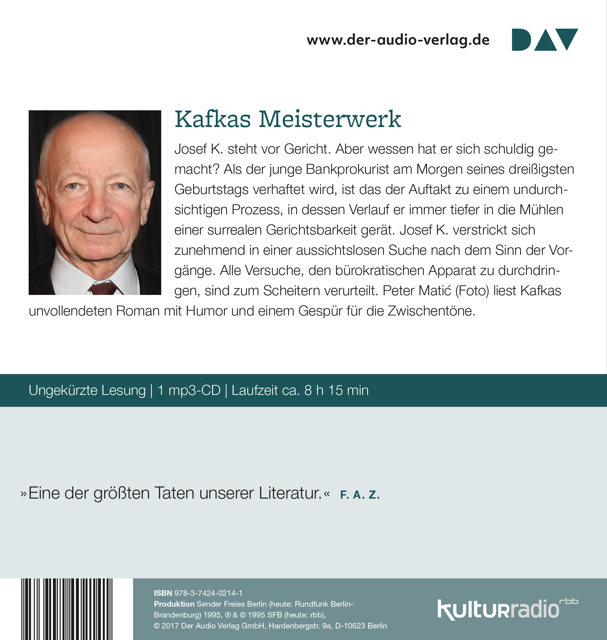 | Schlagworte | Gericht • Gerichtsdiener • Hörbuch; Literaturlesung • Josef K. • kafkaesk • Klassische Belletristik • Labyrinth • Roman • surreal • unvollendet • Urteil • Verhaftung • Verhandlung |
