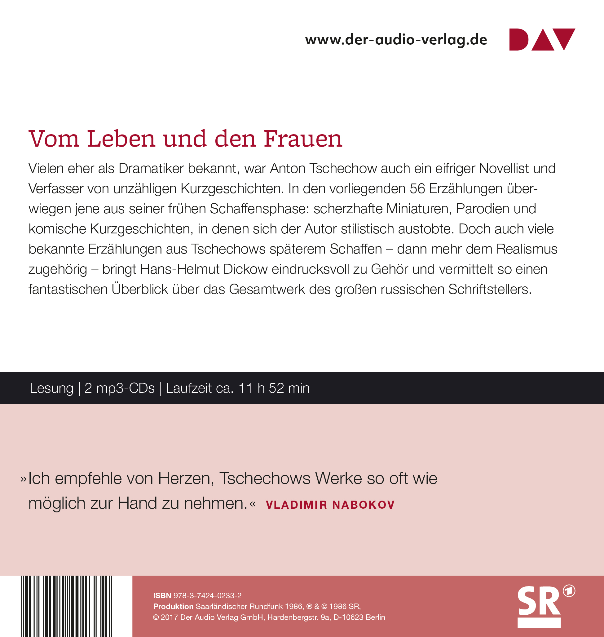 »Ich empfehle von Herzen, Tschechows Werke so oft wie möglich zur Hand zu nehmen.« VLADIMIR NABOKOV »Es gibt keinen Zweifel: Wer sich eine Bibliothek mit Weltliteratur in Form von Hörbüchern aufbauen möchte, kommt an dieser Edition nicht vorbei.« WDR 3 »Hier wird fündig, wer an Hörbuchproduktionen Freude hat, die nicht schnell hingeschludert sind, sondern mit einer Regie-Idee zum Text vom und für den Rundfunk produziert sind.« NDR KULTUR »Mehr Zeit hätte man ja immer gern, aber für diese schönen Hörbücher [...] besonders.« WAZ »Die Hörbuch-Edition 'Große Werke. Große Stimmen.' umfasst herausragende Lesungen deutschsprachiger Sprecherinnen und Sprecher, die in den Archiven der Rundfunkanstalten schlummern.« SAARLÄNDISCHER RUNDFUNK