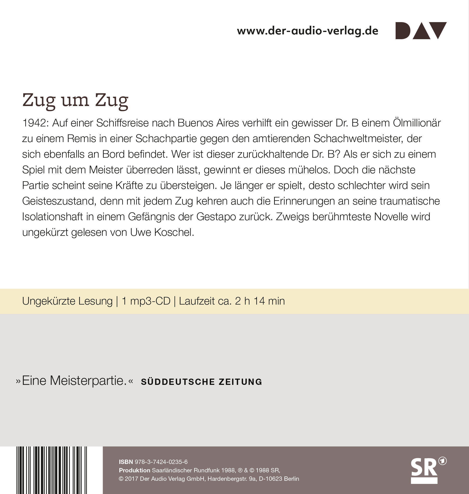 | Schlagworte | 20. Jahrhundert (1900 bis 1999 n. Chr.) • Exil • Flucht • Gestapo • Hörbuch; Literaturlesung • Joseph Roth • Klassische Belletristik • Novelle • Österreich • REMIS • Schachmatt • Schifffahrt • Sternstunden der Menschheit |