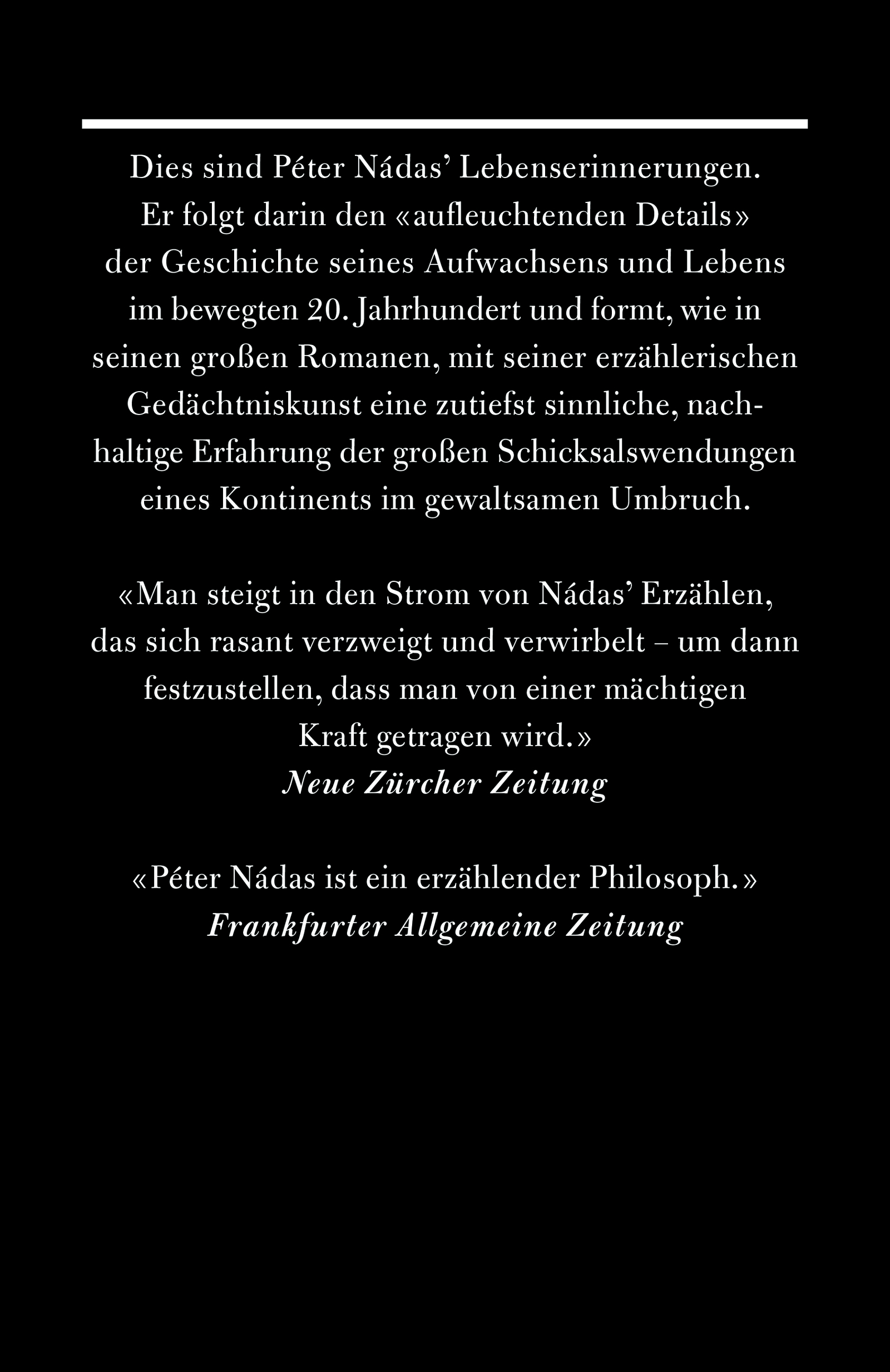 Jedes Ereignis, so Nádas, wirkt auf alle anderen Ereignisse ein - ob in der Politik oder der privaten Lebensgeschichte. Es sind jene Momente, die Geschichte fassbar machen und Erinnerung konstituieren - eben die "aufleuchtenden Details". Deren weitgespannten Verflechtungen folgen Péter Nádas' Memoiren nicht chronologisch, sondern assoziativ, wie in seinen großen Romanen. Und durch jede einzelne Episode zieht sich die geheime Frage: Wie bin ich zu dem geworden, der ich bin, wenn jede persönliche Erinnerung, jede Prägung, untrennbar mit Geschichte verstrickt ist? Wenn jeder Moment des Lebens nur die Spitze eines Eisbergs ist? In die finsteren Tiefen des 20. Jahrhunderts wirft, so Nádas, auch die europäische Aufklärung kaum noch Licht. Und so erzählt dieses Buch nicht zuletzt davon, wie Identität unter schwierigen Bedingungen wächst, während sie sich permanent im Strom der Zeit zu verlieren droht.