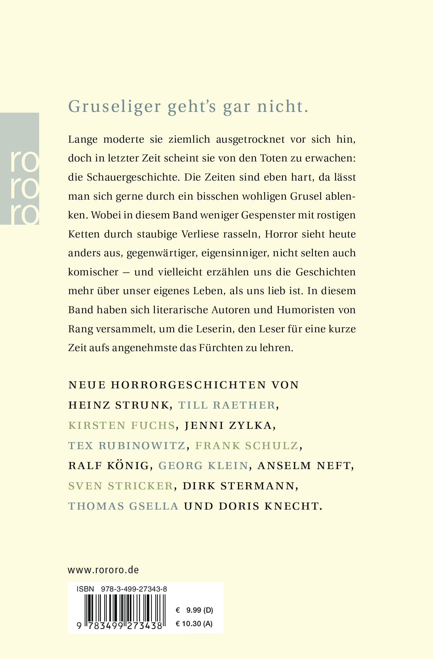Neue Horrorgeschichten von Heinz Strunk, Till Raether, Kirsten Fuchs, Jenni Zylka, Tex Rubinowitz, Frank Schulz, Ralf König, Georg Klein, Anselm Neft, Sven Stricker, Dirk Stermann, Thomas Gsella und Doris Knecht.