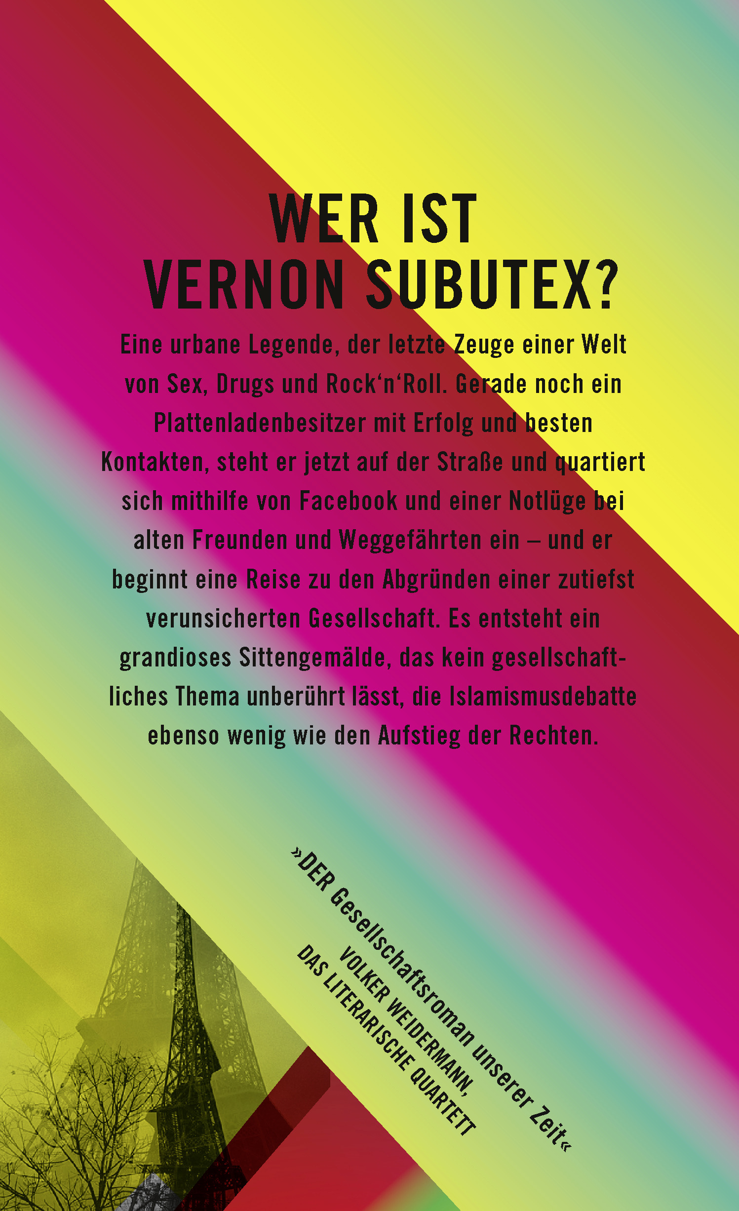 »Despentes aktueller Roman Das Leben des Vernon Subutex ist furios und psychologisch genau. Eine Sensation. Die Geschichte des sozialen Abstiegs des Plattenladenbesitzers Vernon Subutex ist Porträt einer ganzen Generation und Dokument einer sozioökonomischen Zeitwende.«