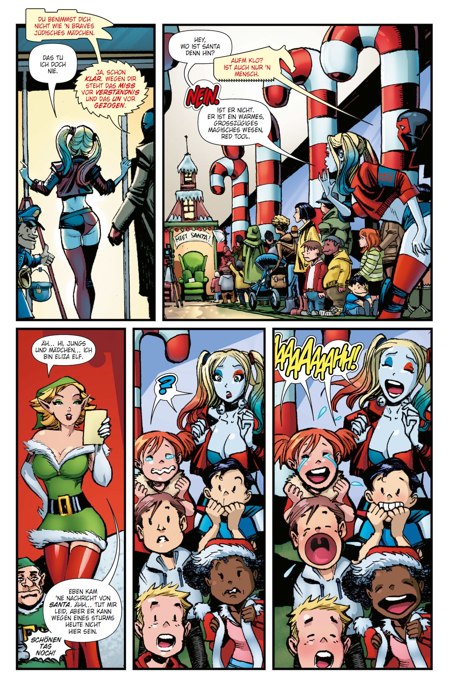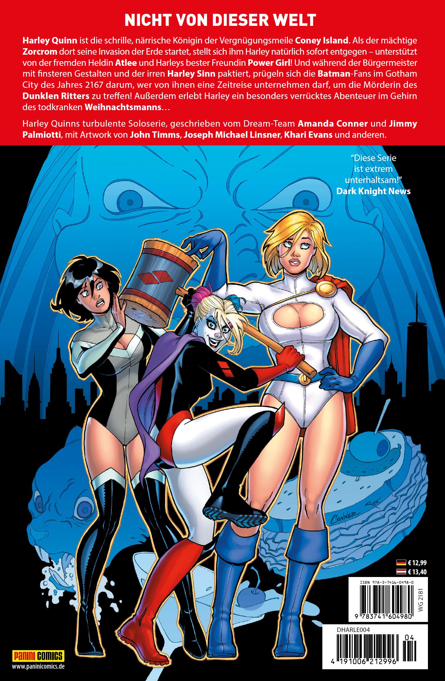 NICHT VON DIESER WELTHarley Quinn ist die schrille, närrische Königin der Vergnügungsmeile Coney Island. Als der mächtige Zorcrom dort seine Invasion der Erde startet, stellt sich ihm Harley natürlich sofort entgegen - unterstützt von der fremden Heldin Atlee und Harleys bester Freundin Power Girl! Und während der Bürgermeister mit finsteren Gestalten und der irren Harley Sinn paktiert, prügeln sich die Batman-Fans im Gotham City des Jahres 2167 darum, wer von ihnen eine Zeitreise unternehmen darf, um die Mörderin des Dunklen Ritters zu treffen!Außerdem erlebt Harley ein besonders verrücktes Abenteuer im Gehirn des todkranken Weihnachtsmanns...Harley Quinns turbulente Soloserie, geschrieben vom Dream-Team Amanda Conner und Jimmy Palmiotti, mit Artwork von John Timms, Joseph Michael Linsner, Khari Evans und anderen.