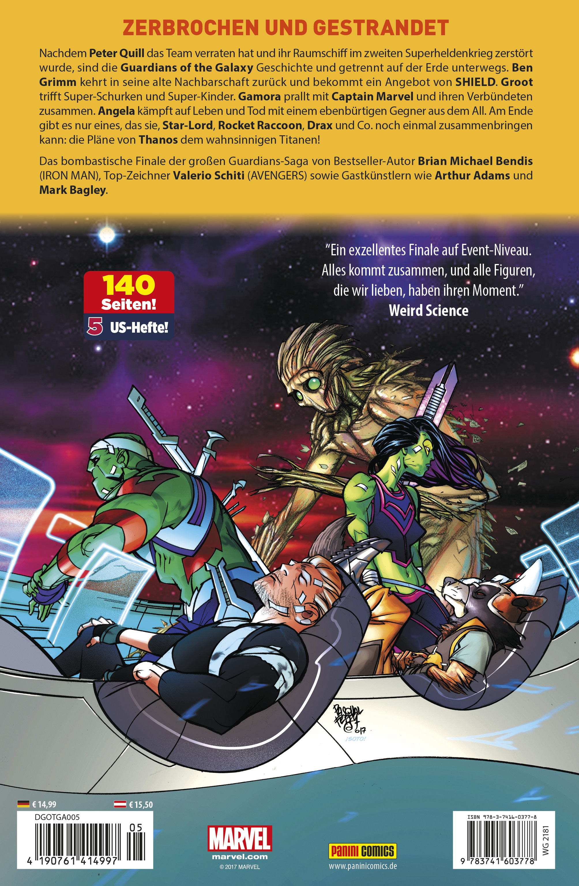 ZERBROCHEN UND GESTRANDETNachdem Peter Quill das Team verraten hat und ihr Raumschiff im zweiten Superheldenkrieg zerstört wurde, sind die Guardians of the Galaxy Geschichte und getrennt auf der Erde unterwegs. Ben Grimm kehrt in seine alte Nachbarschaft zurück und bekommt ein Angebot von SHIELD. Groot trifft Superschurken und Super-Kinder. Gamora prallt mit Captain Marvel und ihren Verbündeten zusammen. Angela kämpft auf Leben und Tod mit einem ebenbürtigen Gegner aus dem All. Am Ende gibt es nur eines, das sie, Star-Lord, Rocket Raccoon, Drax und Co. noch einmal zusammenbringen kann: die Pläne von Thanos dem wahnsinnigen Titanen!Das bombastische Finale der großen Guardians-Saga von Bestseller-Autor Brian Michael Bendis (IRON MAN), Top-Zeichner Valerio Schiti (AVENGERS) sowie Gastkünstlern wie Arthur Adams und Mark Bagley.