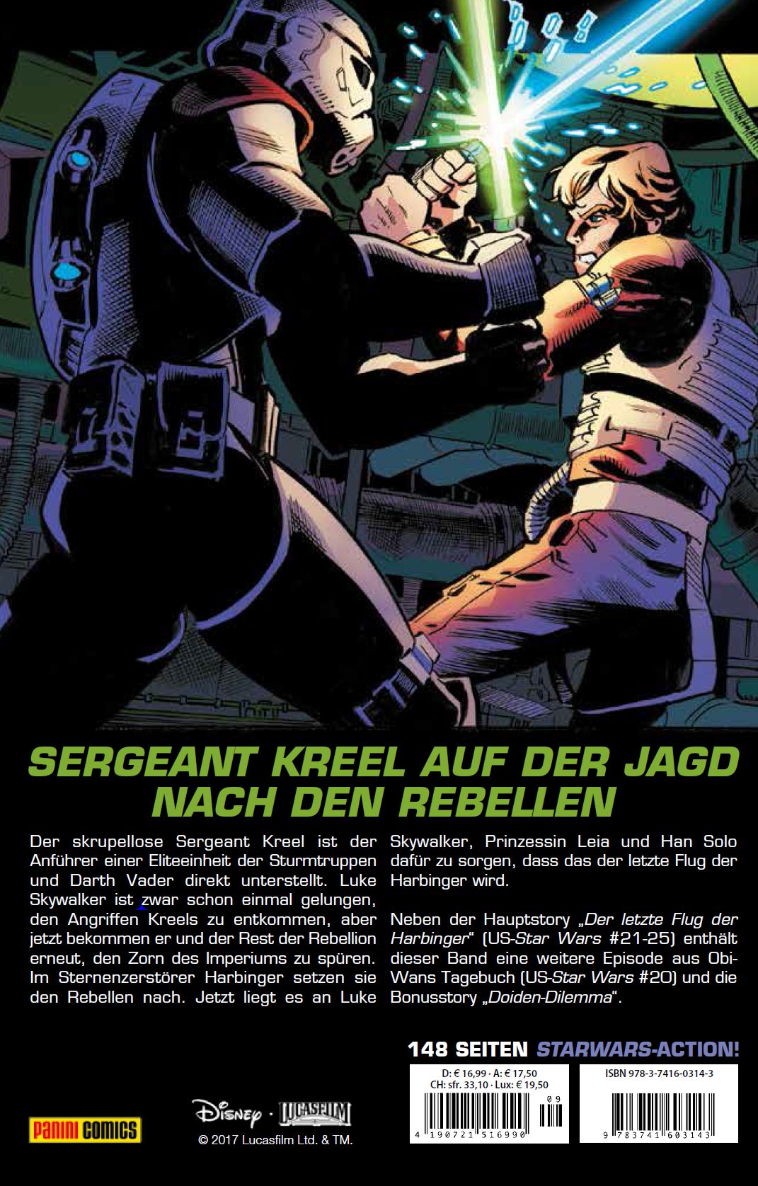 SERGEANT KREEL AUF DER JAGD NACH DEN REBELLENDer skrupellose Sergeant Kreel ist der Anführer einer Eliteeinheit der Sturmtruppen und Darth Vader direkt unterstellt. Luke Skywalker ist zwar schon einmal gelungen, den Angriffen Kreels zu entkommen, aber jetzt bekommen er und der Rest der Rebellion erneut, den Zorn des Imperiums zu spüren. Im Sternenzerstörer Harbinger setzen sie den Rebellen nach. Jetzt liegt es an Luke Skywalker, Prinzessin Leia und Han Solo dafür zu sorgen, dass das der letzte Flug der Harbinger wird.Neben der Hauptstory "Der letzte Flug der Harbinger" (US-Star Wars #21-25) enthält dieser Band eine weitere Episode aus Obi-Wans Tagebuch (US-Star Wars #20) und die Bonusstory "Doiden-Dilemma".