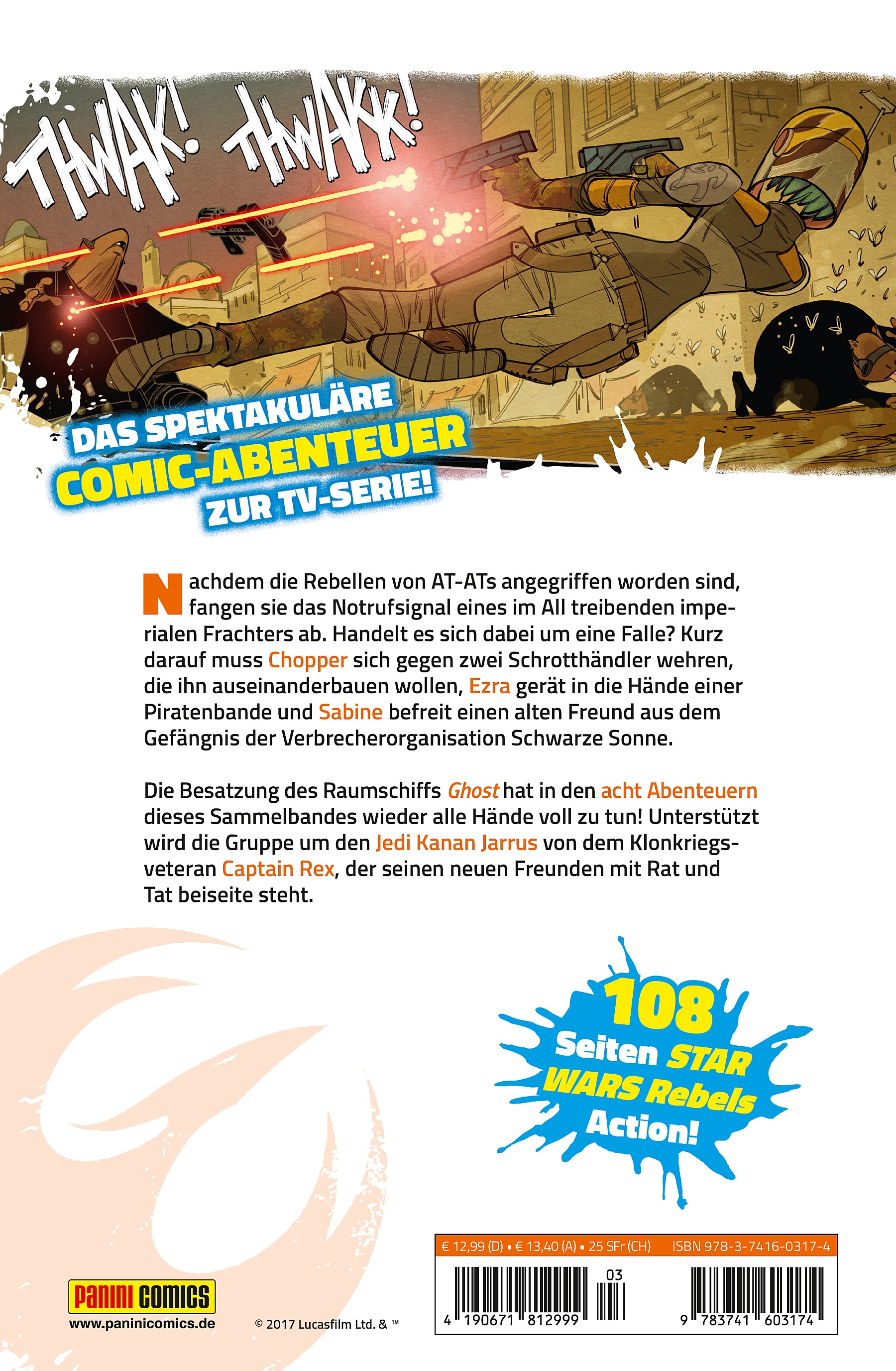 Nachdem die Rebellen von AT-ATs angegriffen worden sind, fangen sie das Notrufsignal eines im All treibenden imperialen Frachters ab. Handelt es sich dabei um eine Falle? Kurz darauf muss Chopper sich gegen zwei Schrotthändler wehren, die ihn auseinanderbauen wollen, Ezra gerät in die Hände einer Piratenbande und Sabine befreit einen alten Freund aus dem Gefängnis der Verbrecherorganisation Schwarze Sonne.Die Besatzung des Raumschiffs Ghost hat in den acht Abenteuern dieses Sammelbandes wieder alle Hände voll zu tun! Unterstützt wird die Gruppe um den Jedi Kanan Jarrus von dem Klonkriegsveteran Captain Rex, der seinen neuen Freunden mit Rat und Tat beiseite steht.Das spektakuläre Comic-Abenteuer zur TV-Serie!