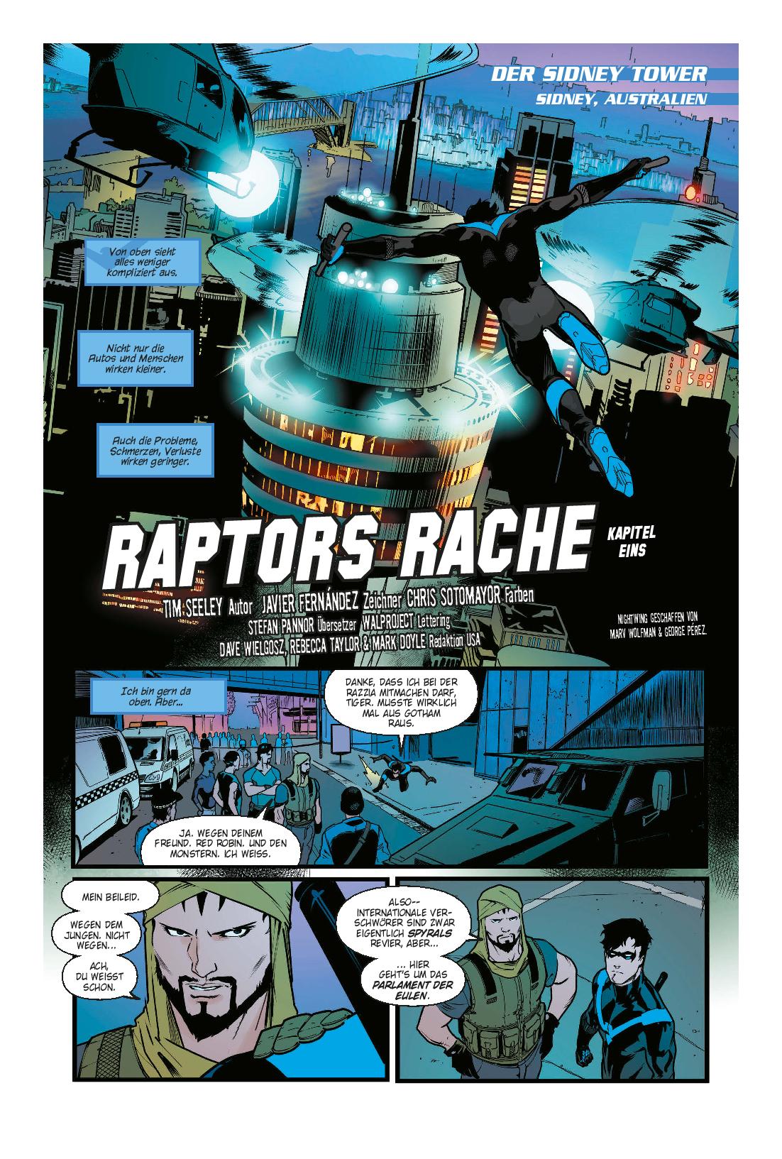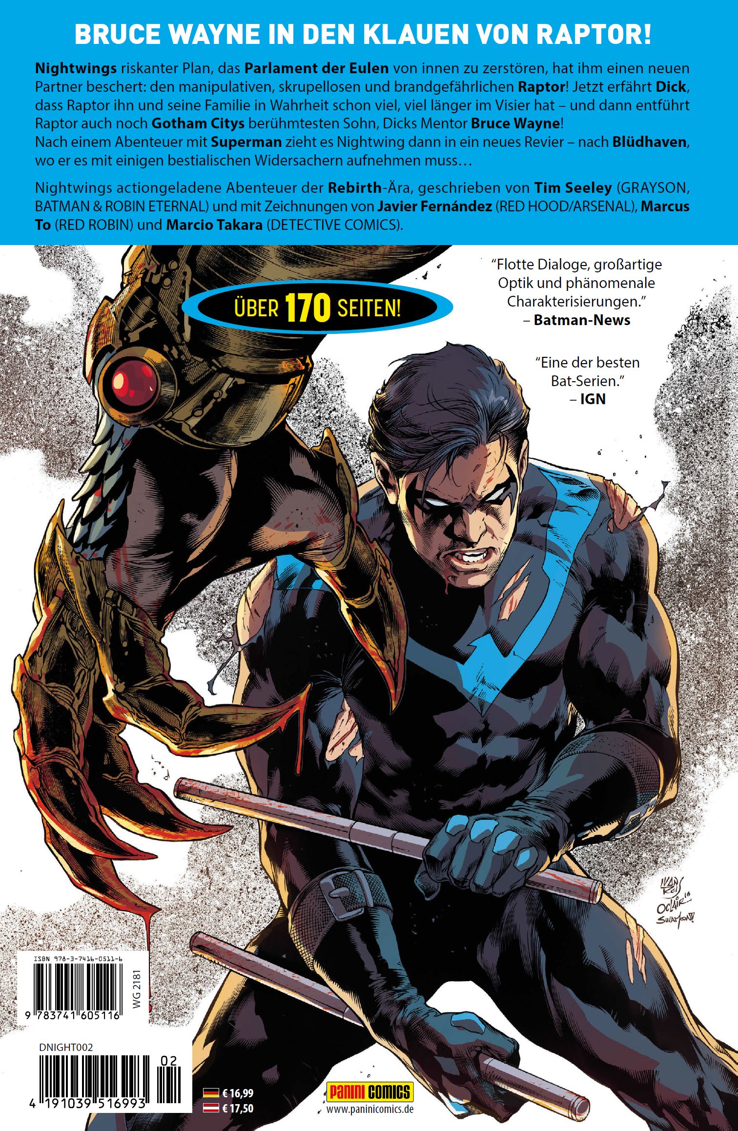 BRUCE WAYNE IN DEN KLAUEN VON RAPTOR!Nightwings riskanter Plan, das Parlament der Eulen von innen zu zerstören, hat ihm einen neuen Partner beschert: den manipulativen, skrupellosen und brandgefährlichen Raptor! Jetzt erfährt Dick, dass Raptor ihn und seine Familie in Wahrheit schon viel, viel länger im Visier hat - und dann entführt Raptor auch noch Gotham Citys berühmtesten Sohn, Dicks Mentor Bruce Wayne! Nach einem Abenteuer mit Superman zieht es Nightwing dann in ein neues Revier - nach Blüdhaven, wo er es mit einigen bestialischen Widersachern aufnehmen muss...Nightwings actiongeladene Abenteuer der Rebirth-Ära, geschrieben von Tim Seeley (GRAYSON, BATMAN & ROBIN ETERNAL) und mit Zeichnungen von Javier Fernández (RED HOOD/ARSENAL), Marcus To (RED ROBIN) und Marcio Takara (DETECTIVE COMICS).