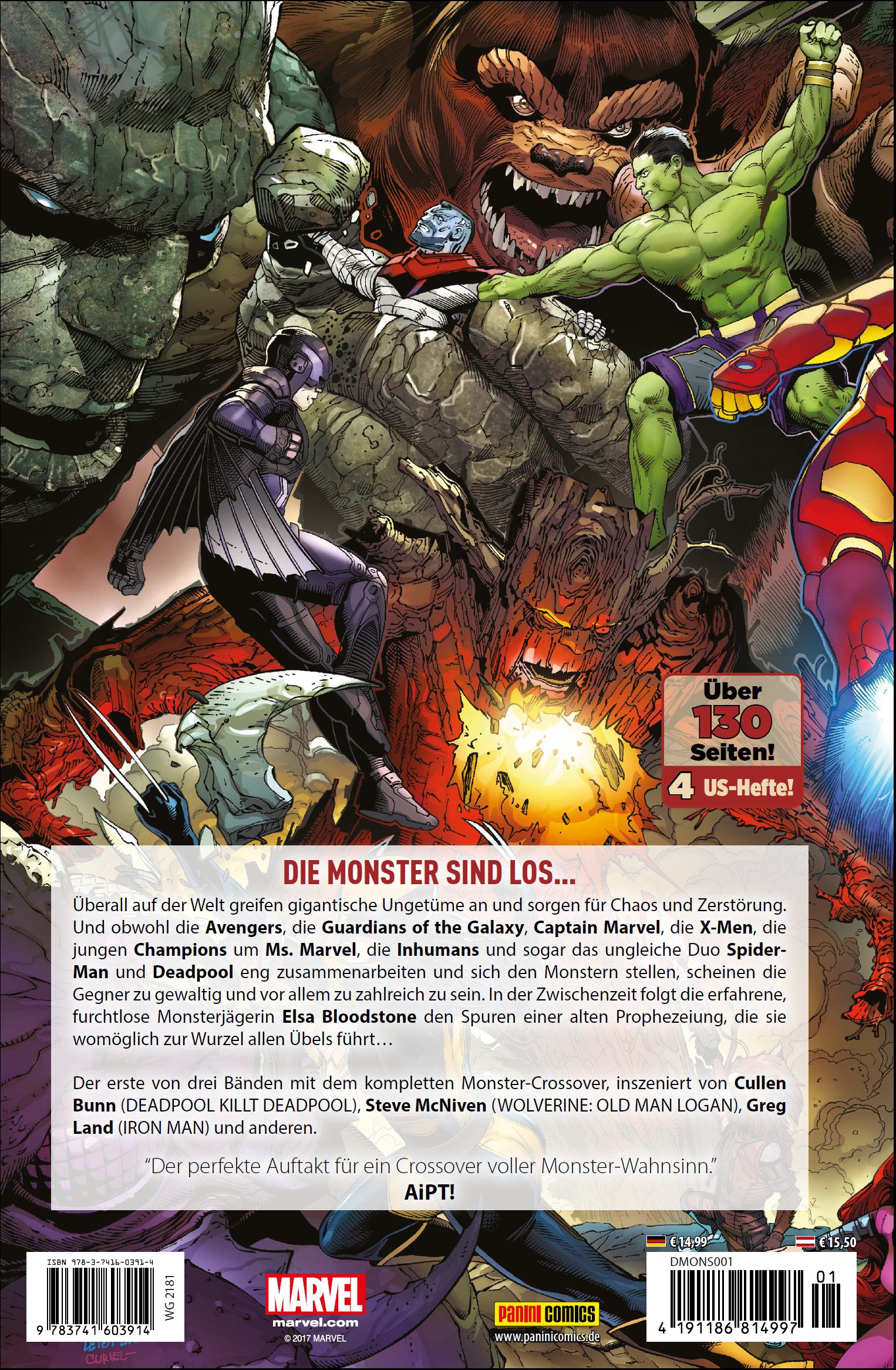HELDEN UND MONSTER von Christian Endres Herzlich willkommen zum ersten von drei Bänden, in denen wir das komplette Crossover Monsters Unleashed – Die Monster sind los veröffentlichen! Die Welt wird darin von zahlreichen Ungeheuern angegriffen, denen sich die Helden gemeinsam stellen: das Avengers-Hauptteam von Sam Wilson, zu dem u. a. die neue Thor Jane Foster und die unerfahrene Wasp Nadia Pym gehören; die von Storm angeführten X-Men, denen sich der alte Wolverine und die junge Jean Grey angeschlossen haben, die via Zeitreise unfreiwillig in die Gegenwart geholt wurden; Königin Medusas außergewöhnliche Inhumans, für die z. B. der Kampfmönch Karnak kämpft; die kosmischen Guardians of the Galaxy; die Champions-Truppe, die aus den Nachwuchshelden Ms. Marvel, Nova, Spider-Man Miles Morales, Cyclops, Viv Vision und dem Hulk Amadeus Cho besteht; Captain Marvel, die der Weltraumbehörde Alpha Flight vorsteht; das junge Genie Lunella Lafayette und ihr Dino-Freund Devil; Spider-Man Peter Parker und Deadpool, die trotz aller Differenzen derzeit oft als Duo zusammenarbeiten, und natürlich die erfahrene Monsterjägerin Elsa Bloodstone…